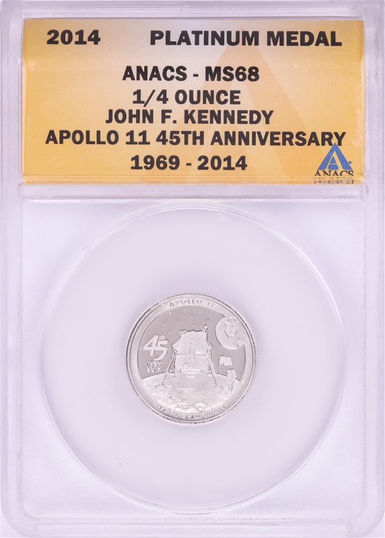 One 2014 Proof 1/4 oz Platinum JFK Apollo 11 Anniversary Medal ANACS MS68. ANACS Certified.