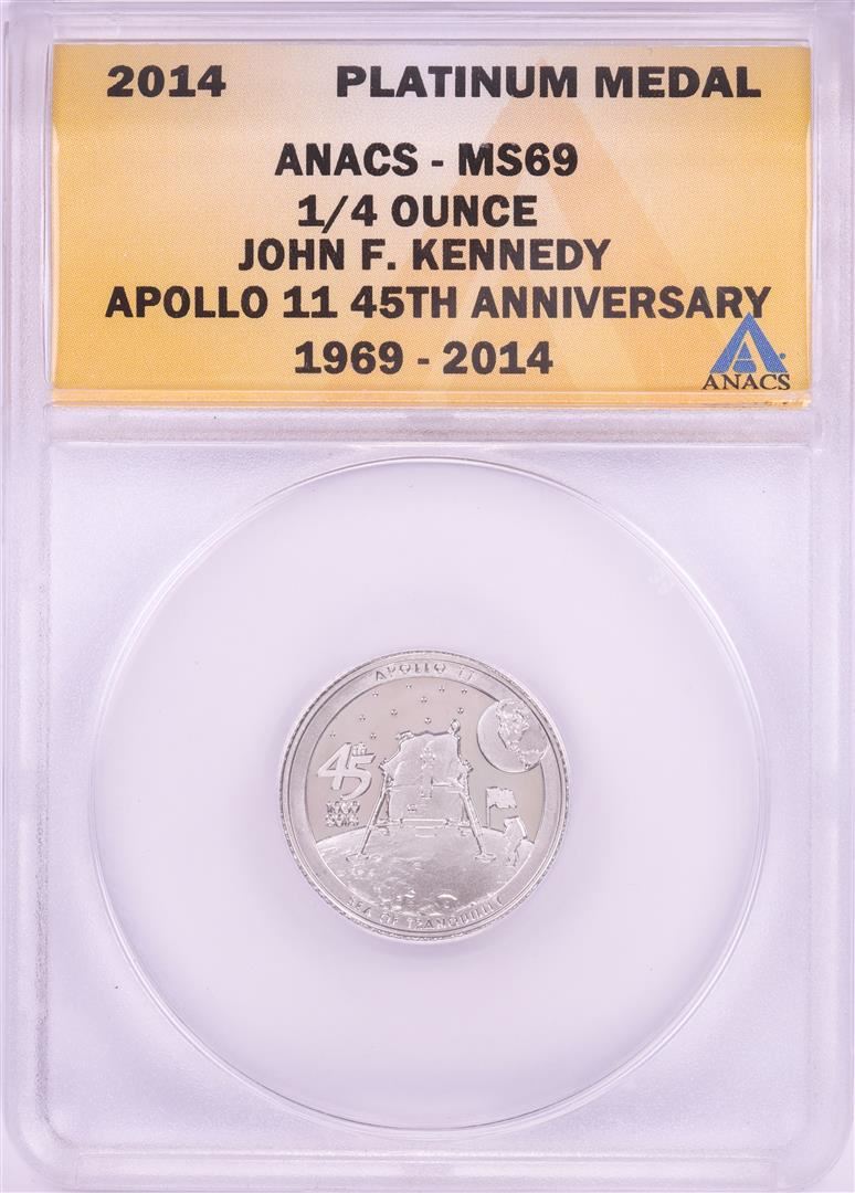 One 2014 Proof 1/4 oz Platinum JFK Apollo 11 Anniversary Medal ANACS MS69. ANACS Certified.