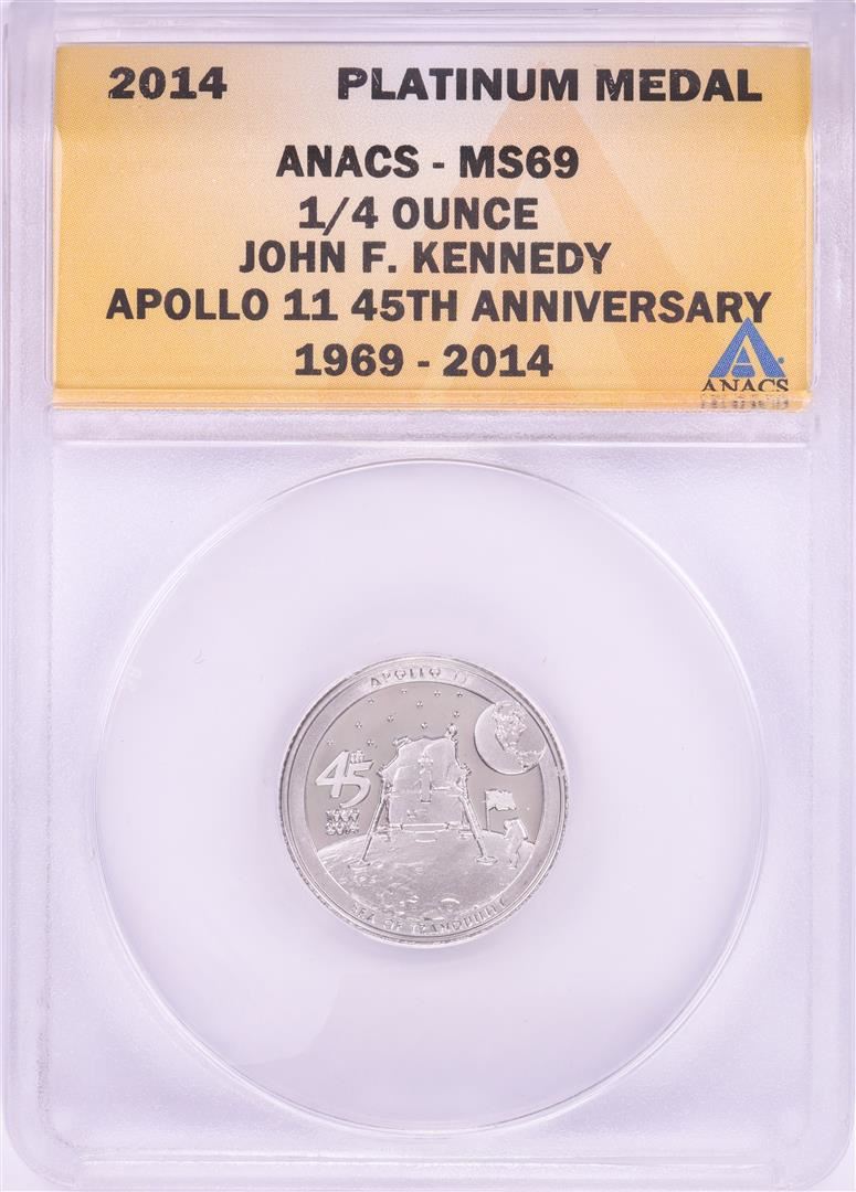 One 2014 Proof 1/4 oz Platinum JFK Apollo 11 Anniversary Medal ANACS MS69. ANACS Certified.