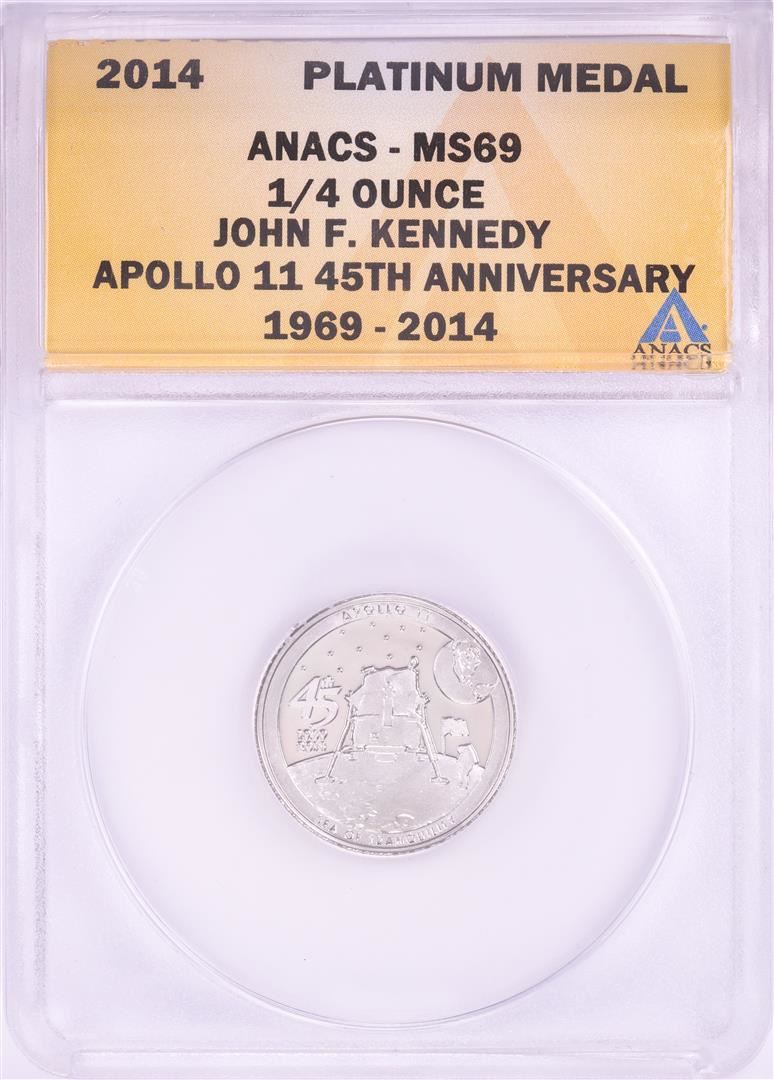 One 2014 Proof 1/4 oz Platinum JFK Apollo 11 Anniversary Medal ANACS MS69. ANACS Certified.