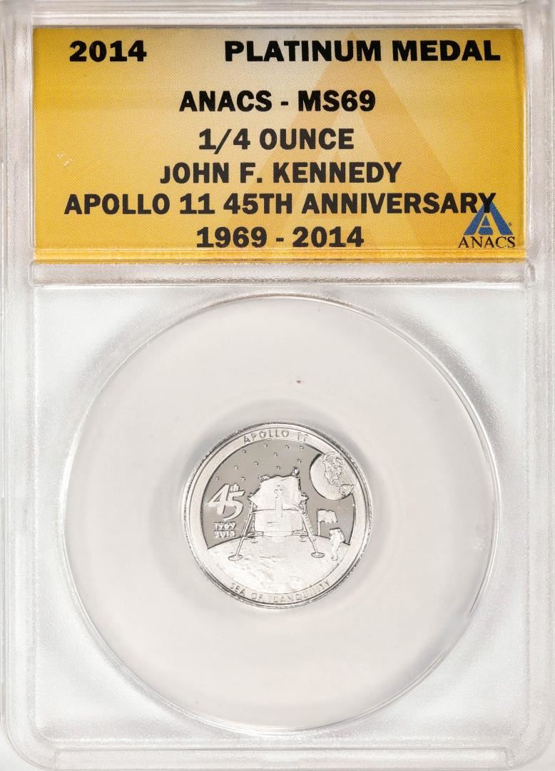 One 2014 Proof 1/4 oz Platinum JFK Apollo 11 Anniversary Medal ANACS MS69. ANACS Certified.
