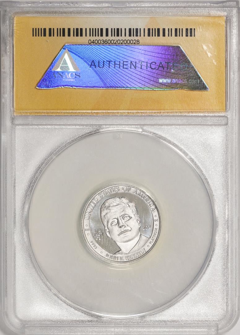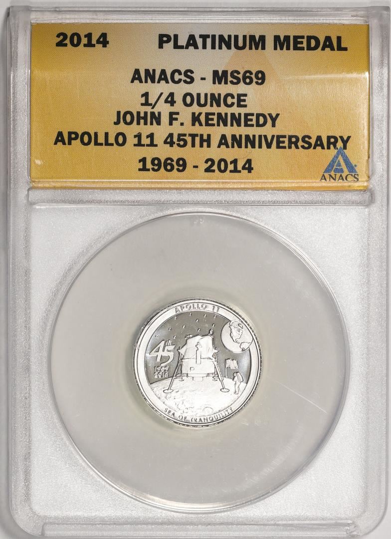One 2014 Proof 1/4 oz Platinum JFK Apollo 11 Anniversary Medal ANACS MS69. ANACS Certified.