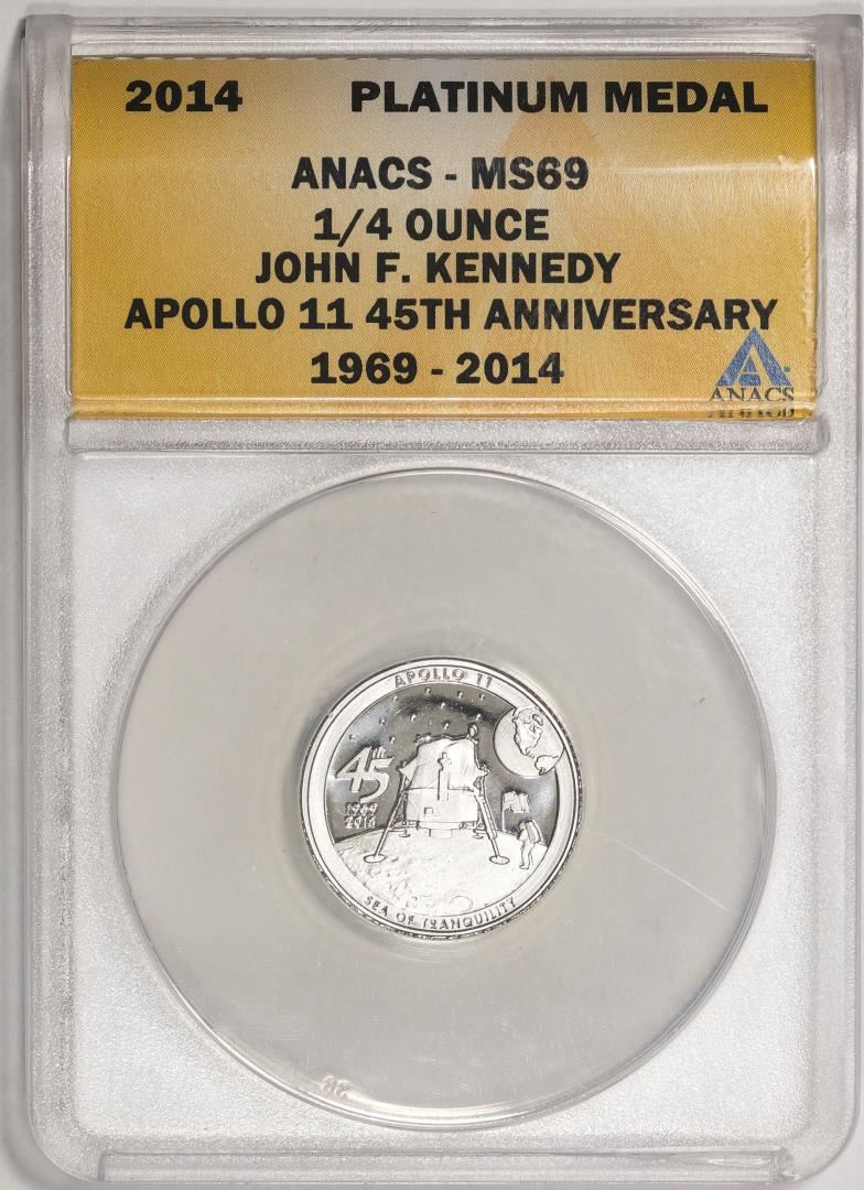 One 2014 Proof 1/4 oz Platinum JFK Apollo 11 Anniversary Medal ANACS MS69. ANACS Certified.