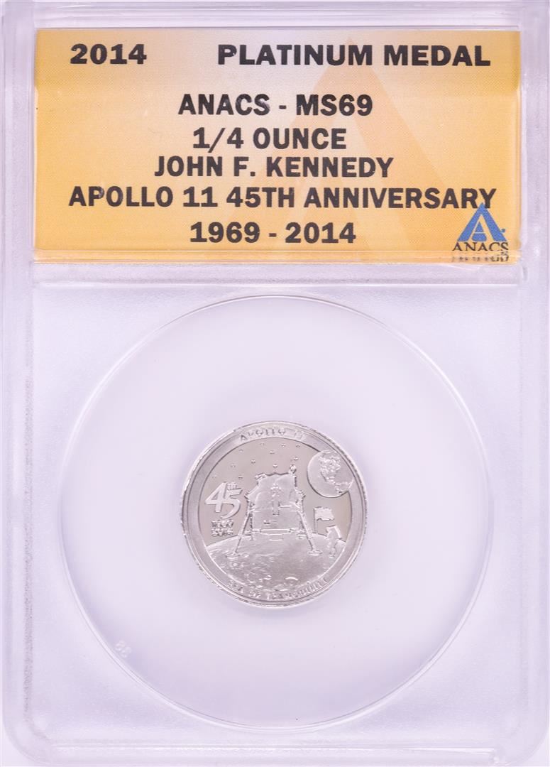 One 2014 Proof 1/4 oz Platinum JFK Apollo 11 Anniversary Medal ANACS MS69. ANACS Certified.