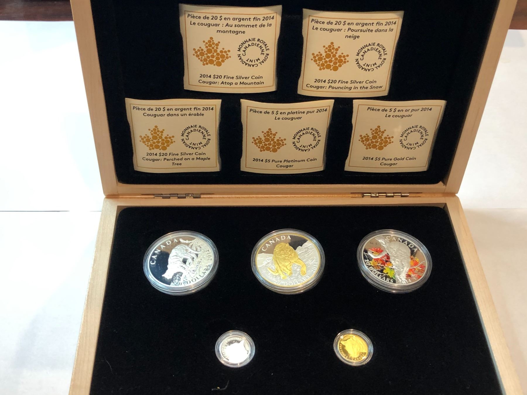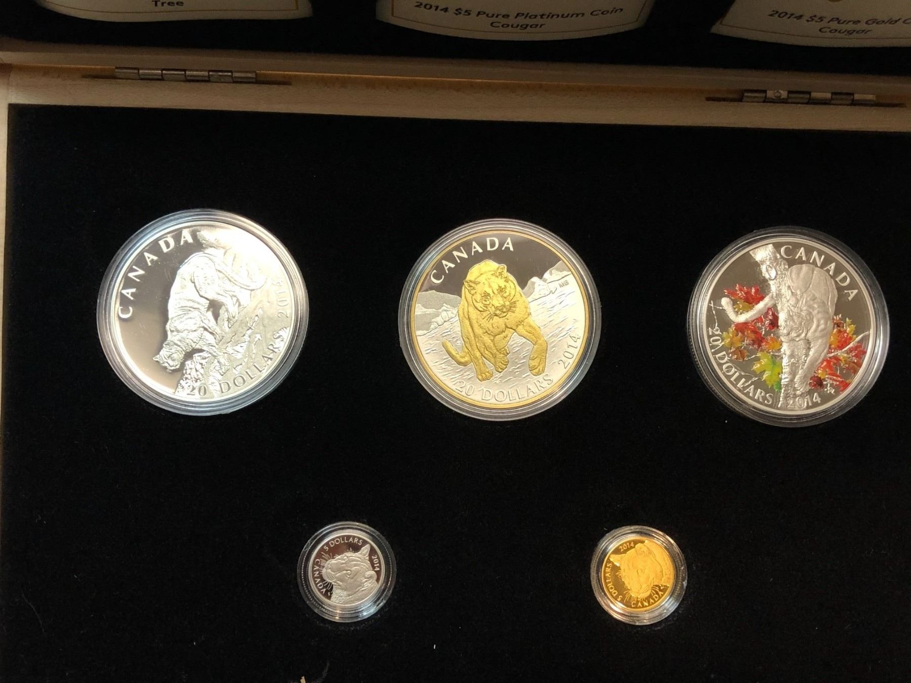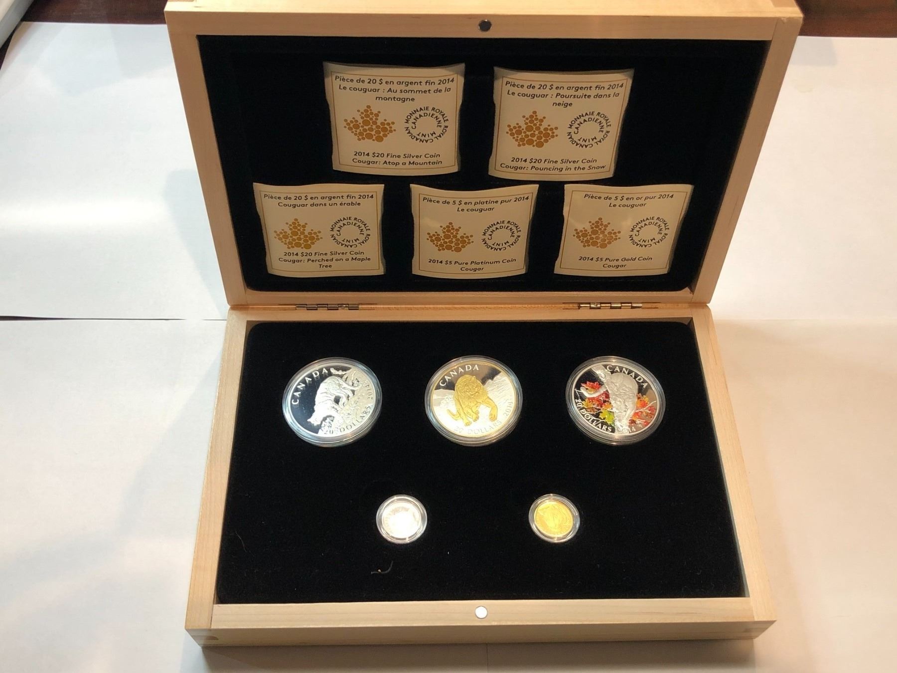 2014 Royal Canadian Mint 5 Coin Gold, Platinum, and Fine Silver Set This set contains 3 $20 99.99$ Fine Silver Coins that weigh 31.39g each, 1 $5 99.95% Pure Platinum coin that weighs 3.13g, and 1 $5 99.99% Pure Gold coin that weighs 3.14g