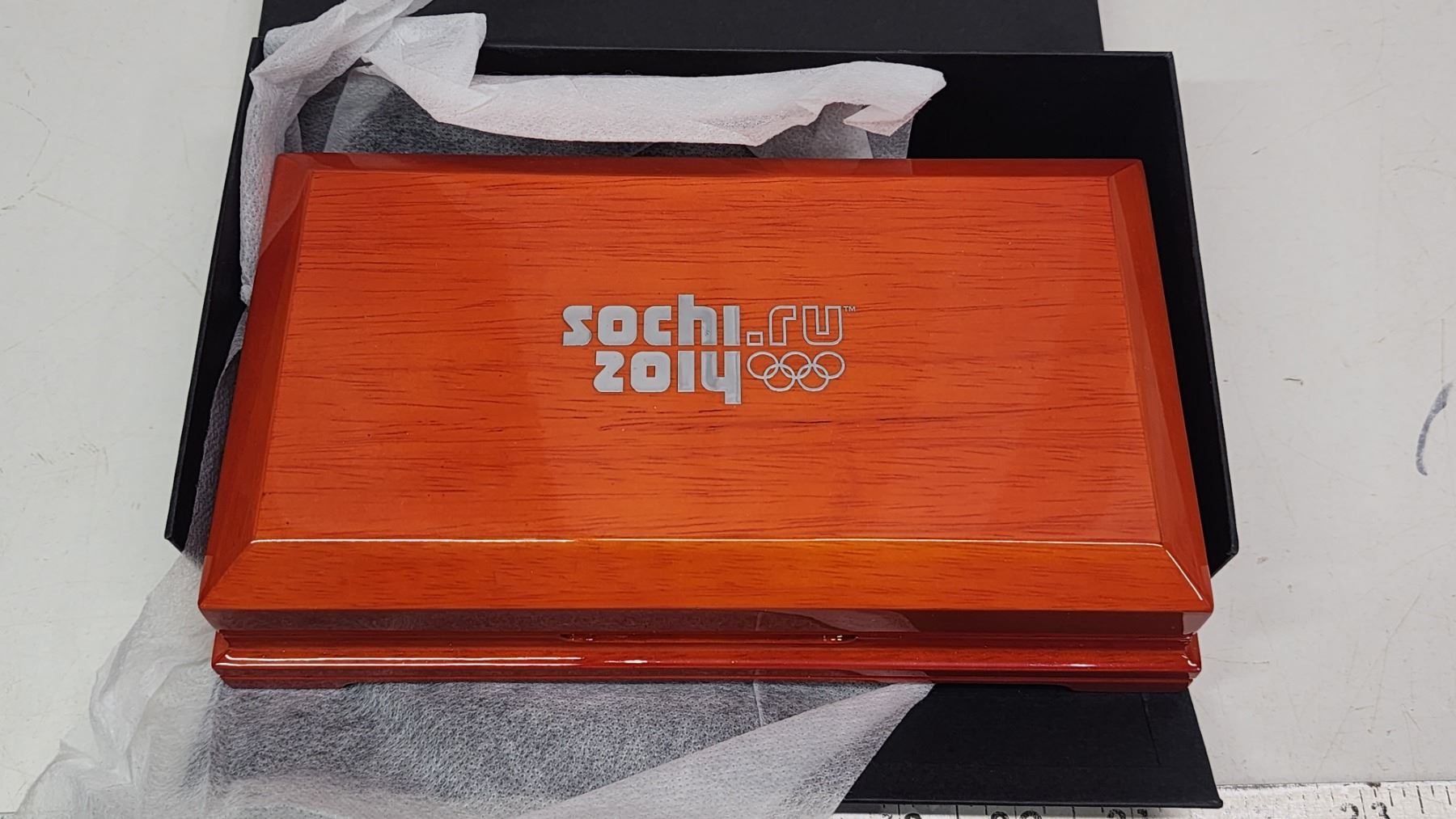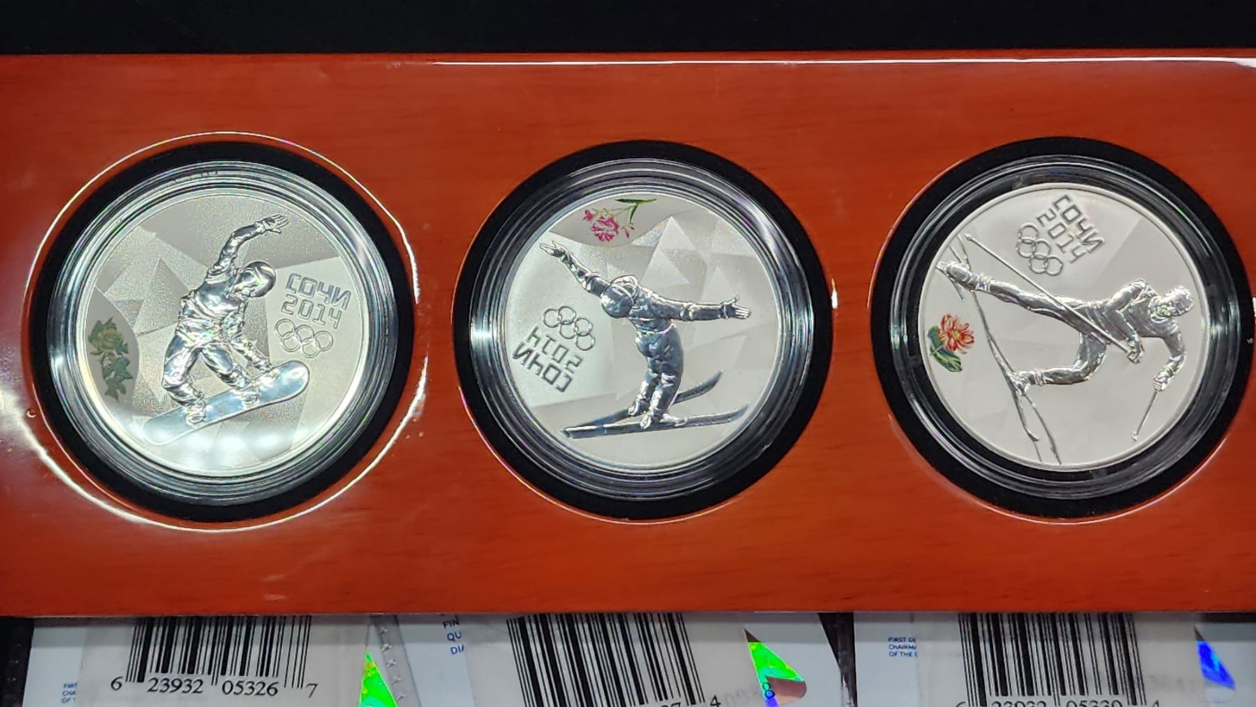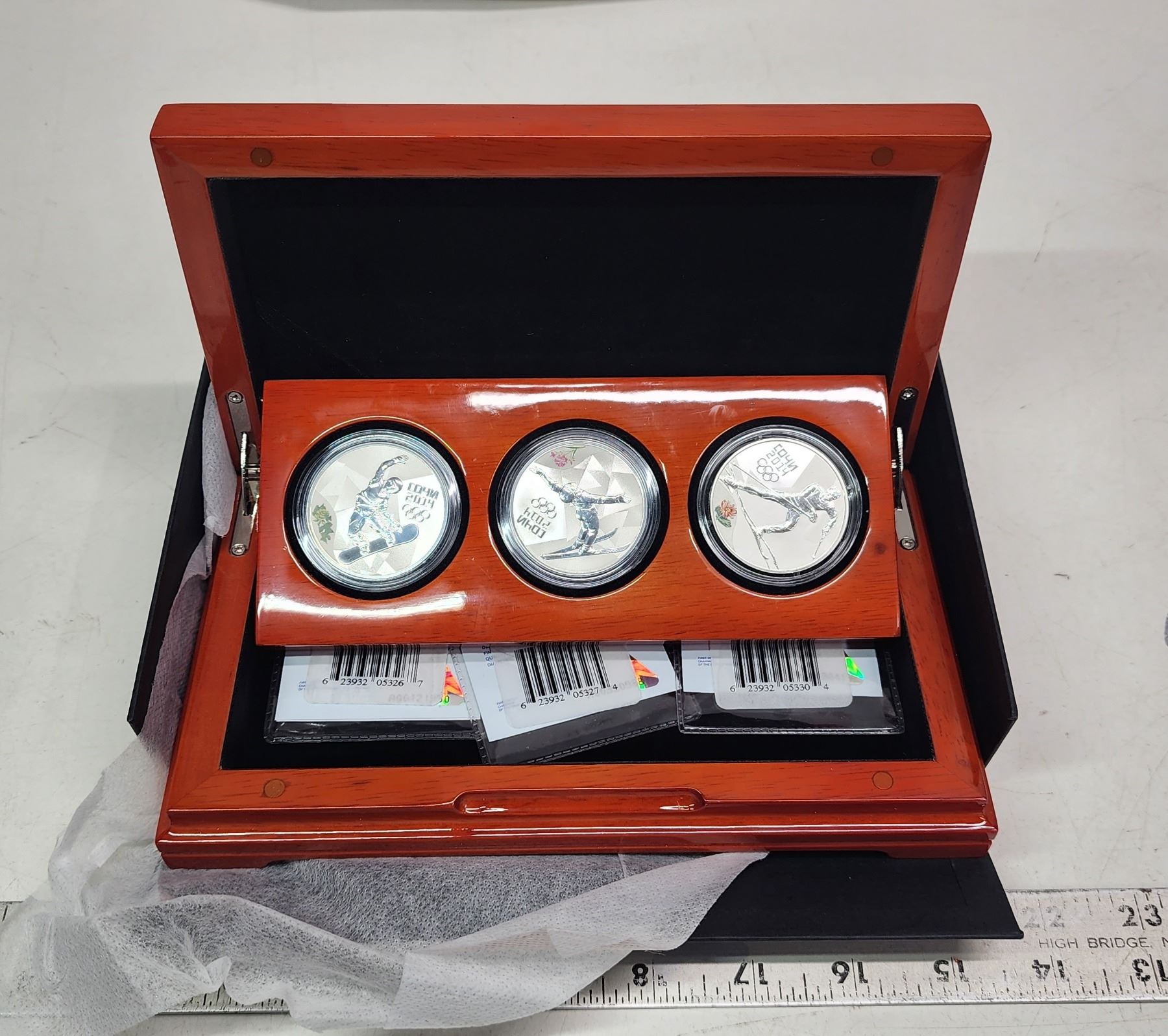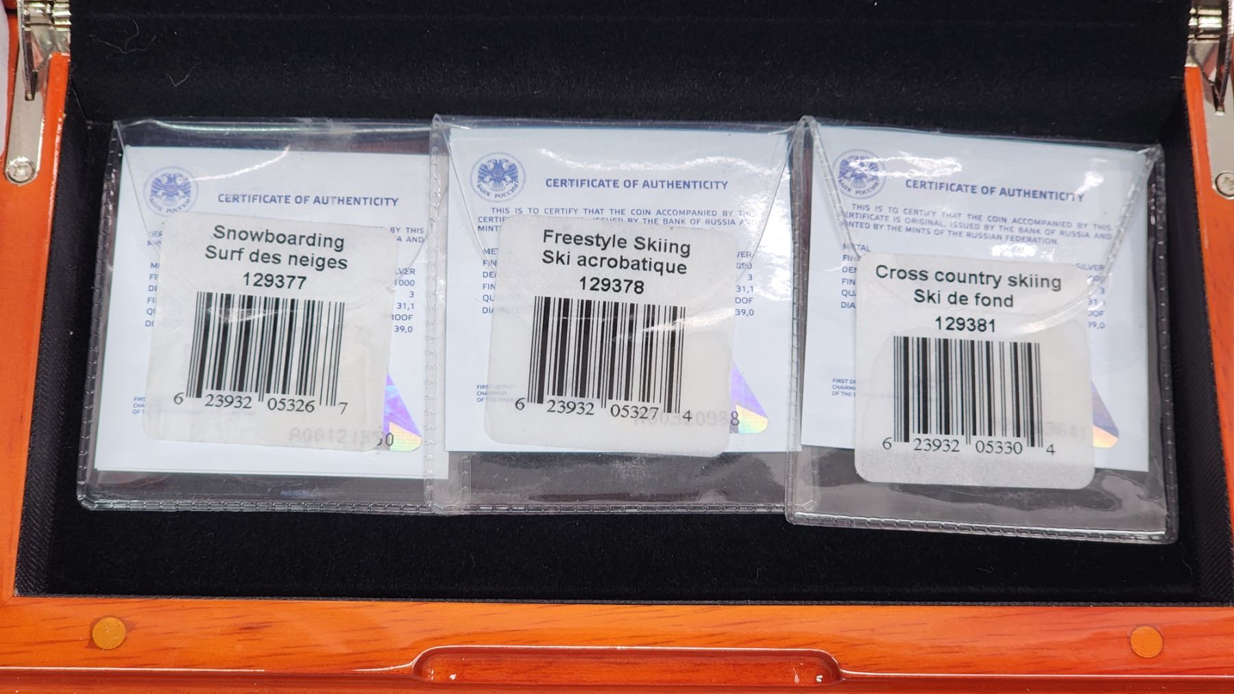 2014 Russian, 3 Ruble silver Sochi, Olympic 3 coin set - in exquisite wooden case - Snowboarding, Free style skiing, and Cross country skiing coins