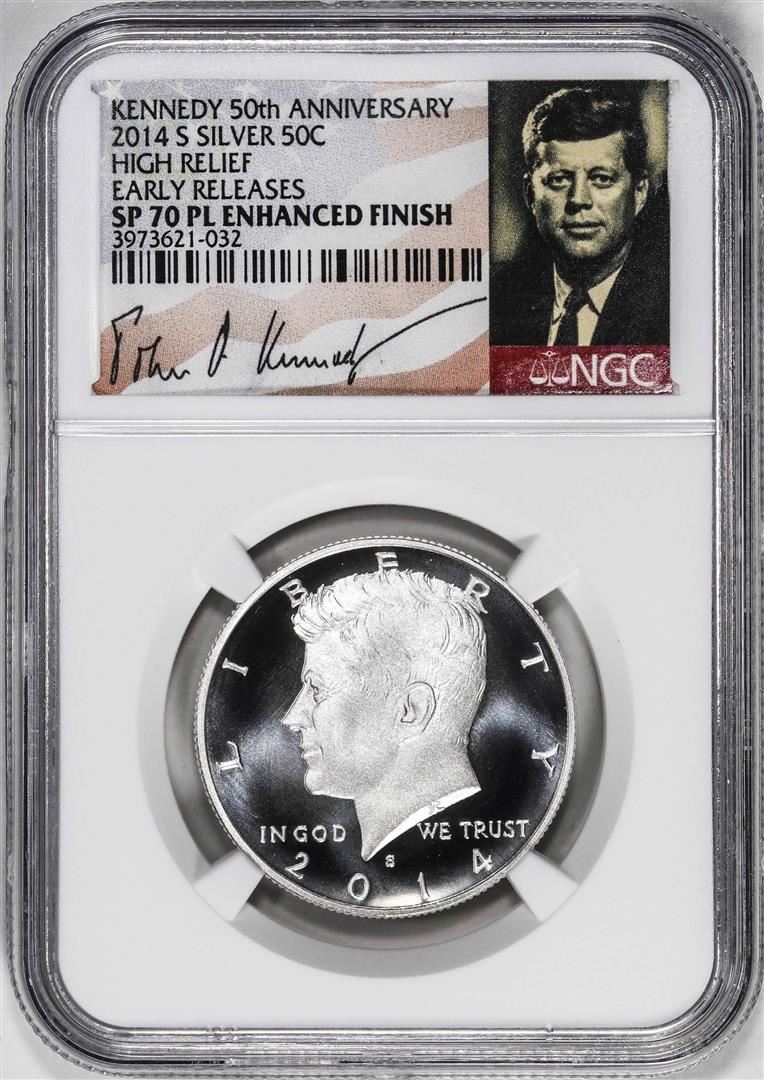 One 2014-S High Relief Kennedy Half Dollar Coin NGC SP70 PL Enhanced Finish JFK Signature. NGC Certified.