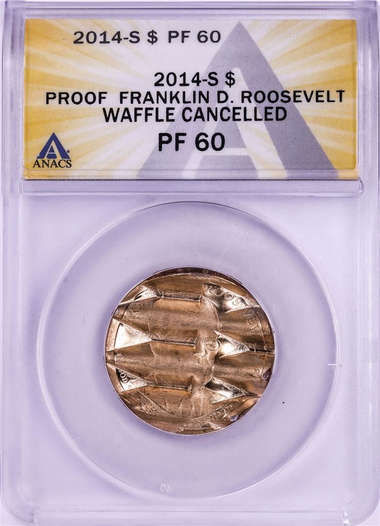 One 2014-S Proof Franklin D. Roosevelt Presidential Dollar Waffle Cancelled Coin ANACS PF60. ANACS Certified.