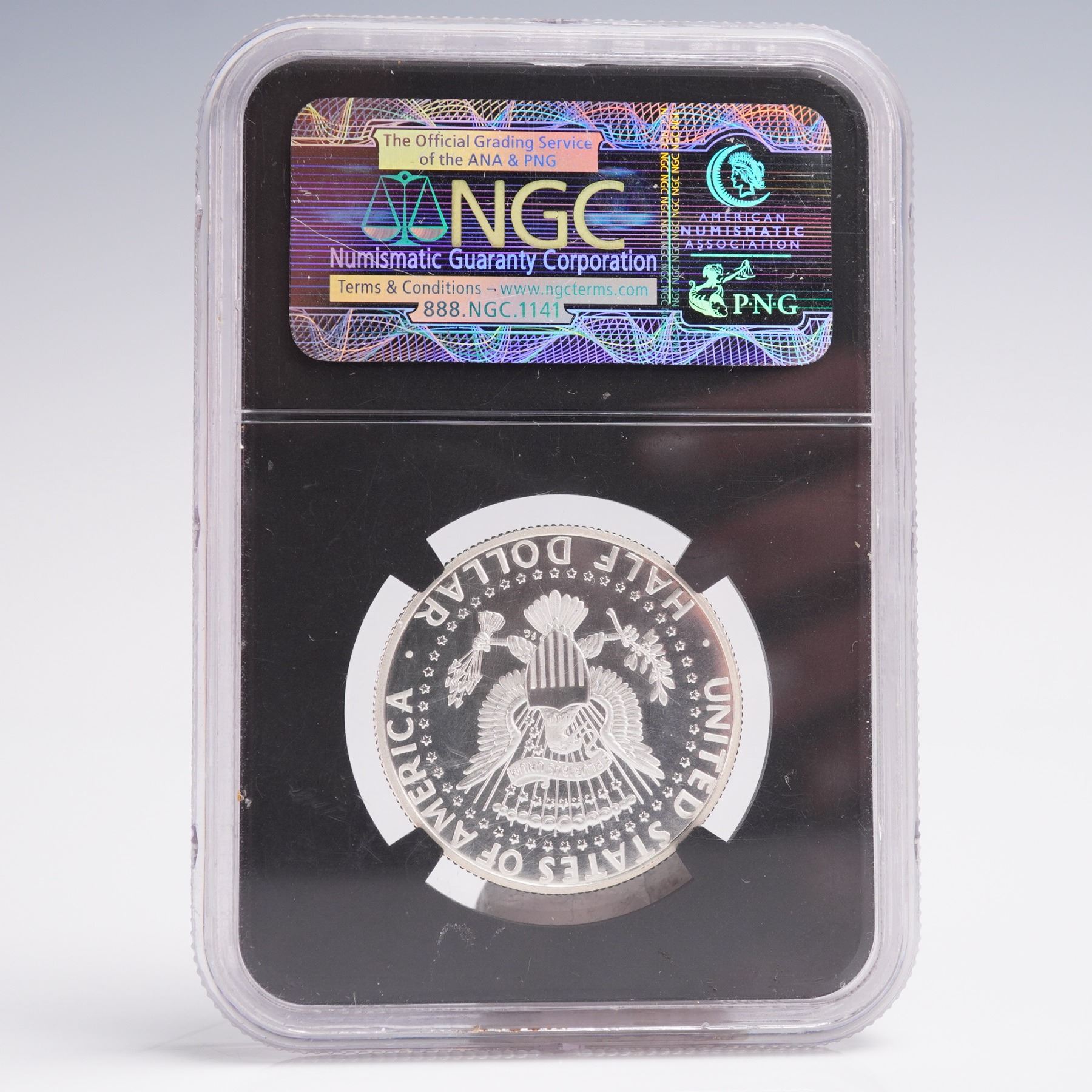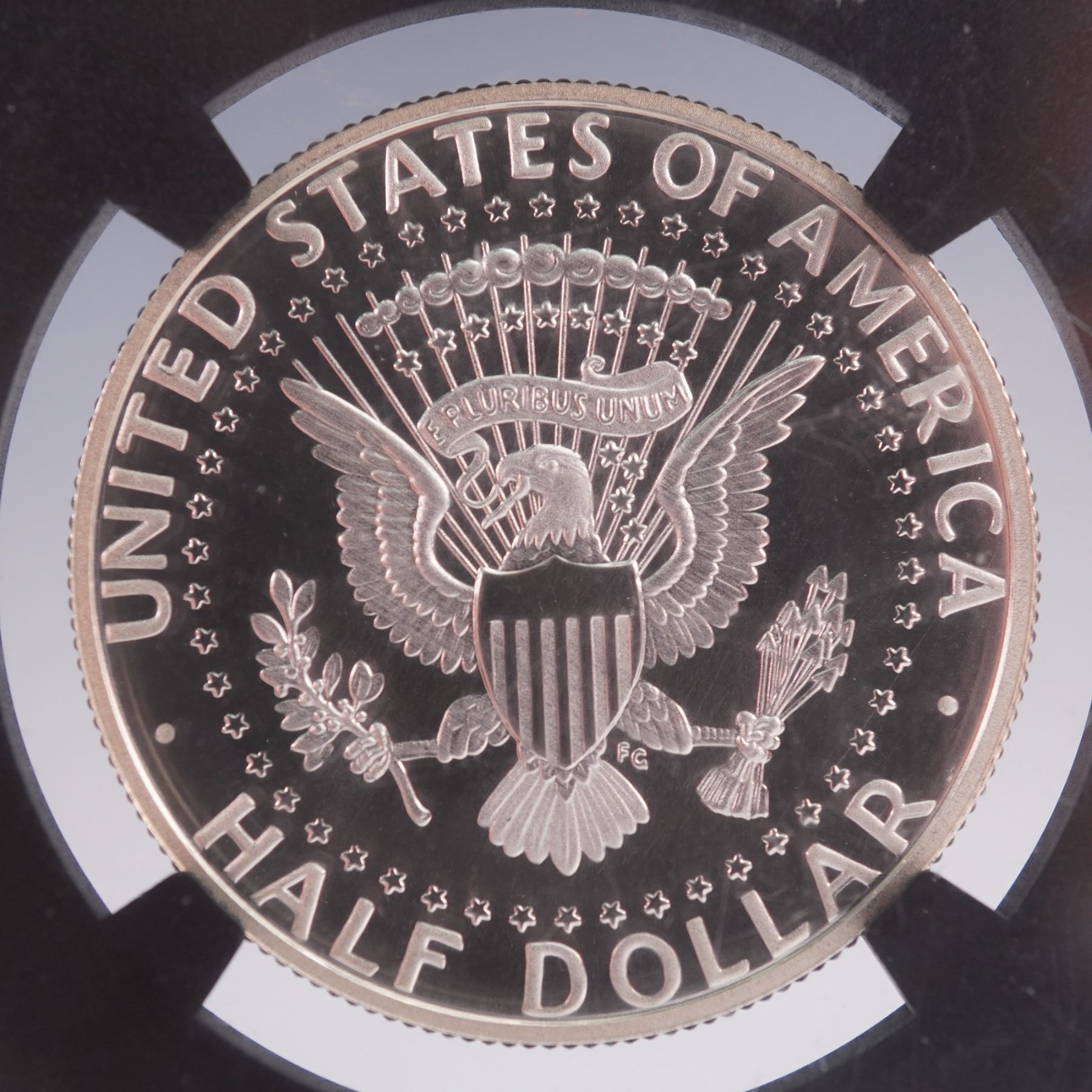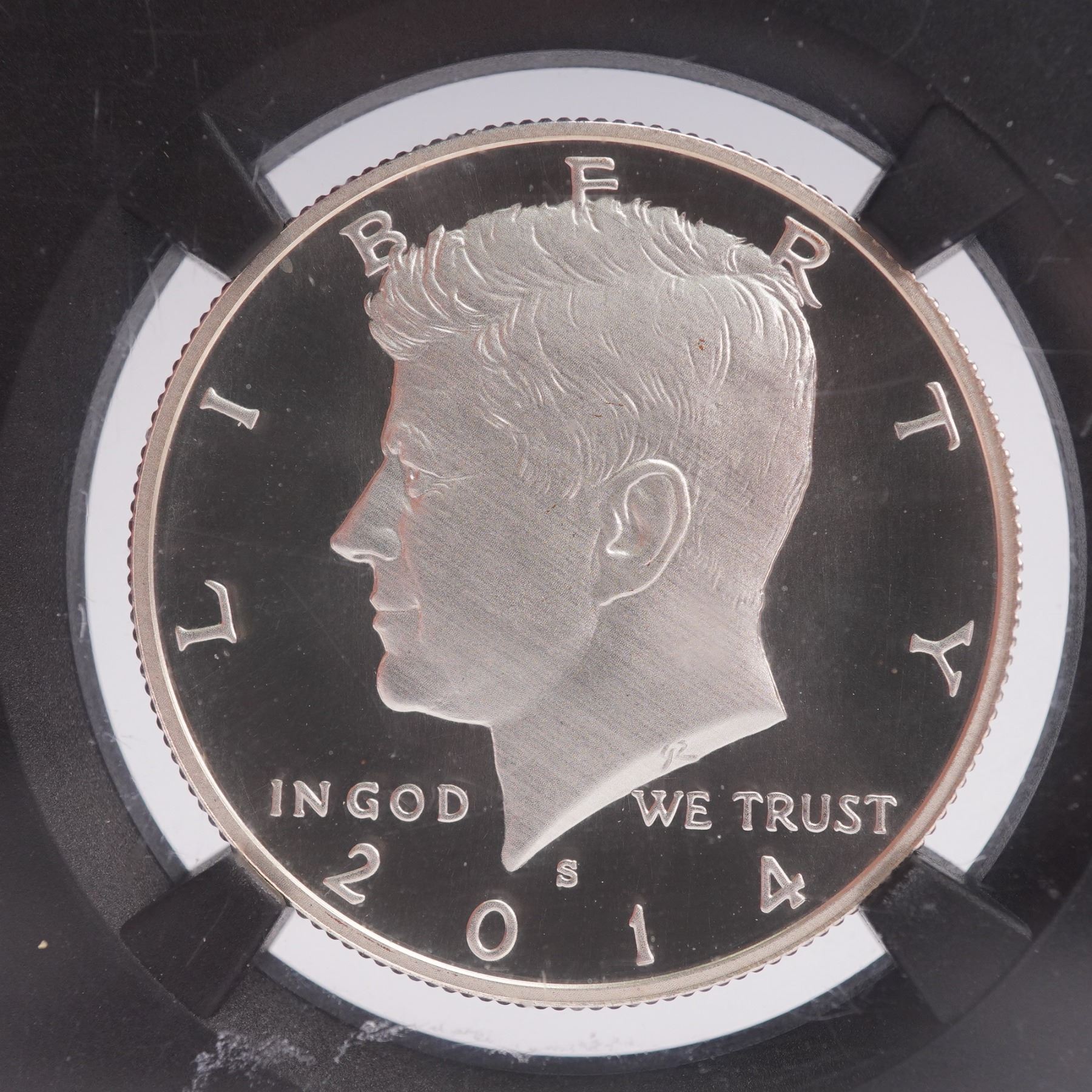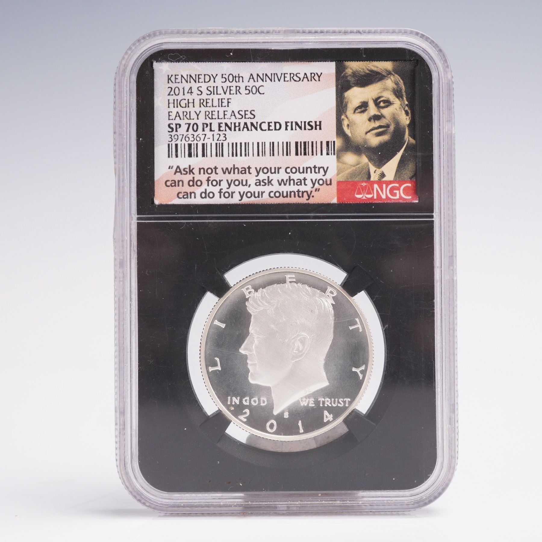Issued to mark the Kennedy Half Dollar's 50th anniversary, this 2014-S Silver example is struck in high relief with an enhanced prooflike finish. Certified SP 70 PL by NGC and designated Early Releases, this flawless coin is presented in a black core holder with the iconic Kennedy quote label: "Ask not what your country can do for you, ask what you can do for your country." The obverse features a bold bust of President John F. Kennedy facing left, with inscriptions LIBERTY, IN GOD WE TRUST, S, and the date 2014. The design was engraved by Gilroy Roberts. On the reverse is the American Presidential Coat of Arms: a heraldic eagle bearing a striped shield, clutching an olive branch and a bundle of thirteen arrows, and holding a scroll inscribed with E PLURIBUS UNUM. Surrounding the eagle are the inscriptions UNITED STATES OF AMERICA and HALF DOLLAR. The reverse was engraved by Frank Gasparro. Struck in Silver (.900).
