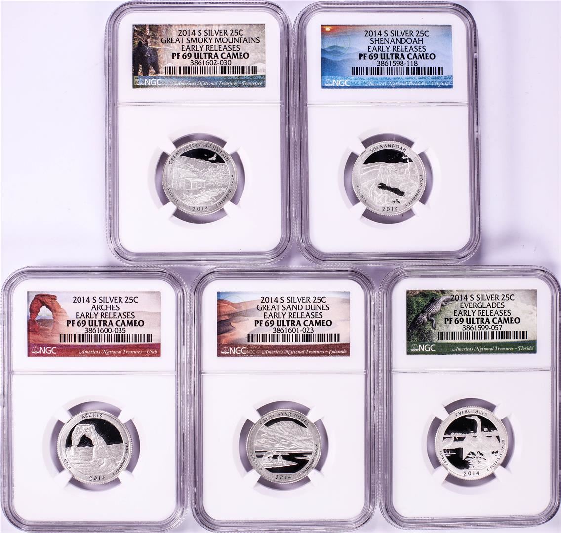 2014-S Silver Proof National Parks Quarter (5) Coin Set NGC PF69 Ultra Cameo ER