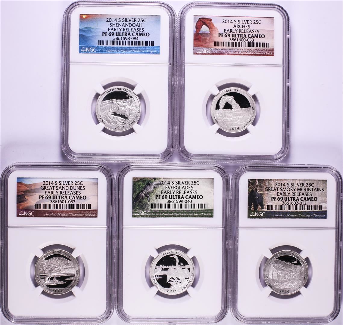 2014-S Silver Proof National Parks Quarter (5) Coin Set NGC PF69 Ultra Cameo