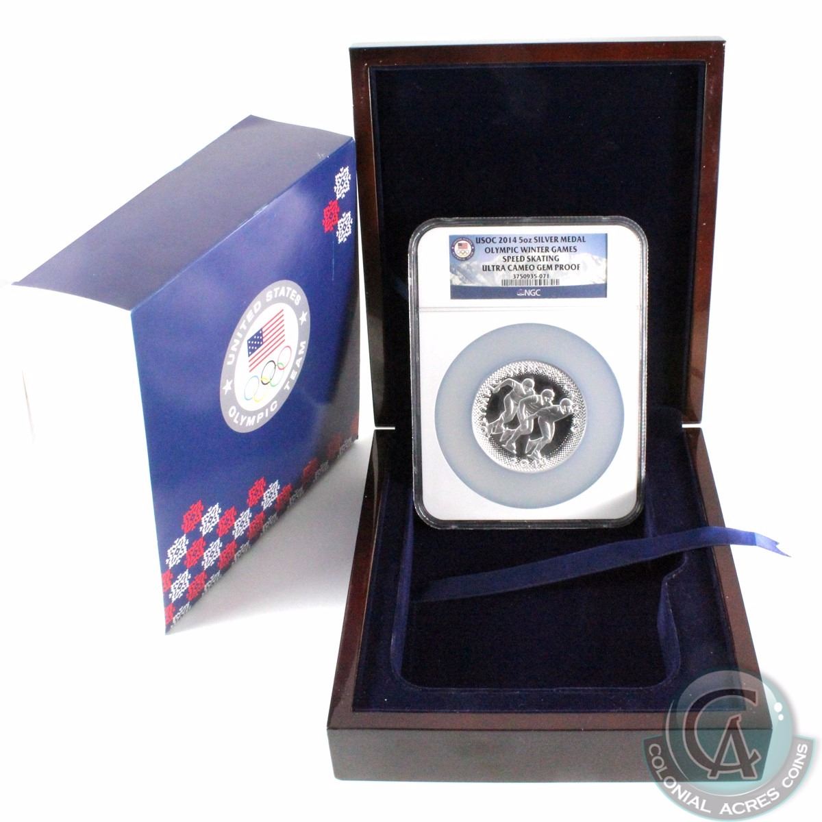 2014 Sochi Olympic Winter Games 5 ounce Pure Silver Medallion Featuring Speed Skating (Tax Exempt). This medallion is NGC Certified Ultra Cameo Gem Proof and was produced by US Olympic Committee. Medallion comes in beautiful wooden display case with COA.