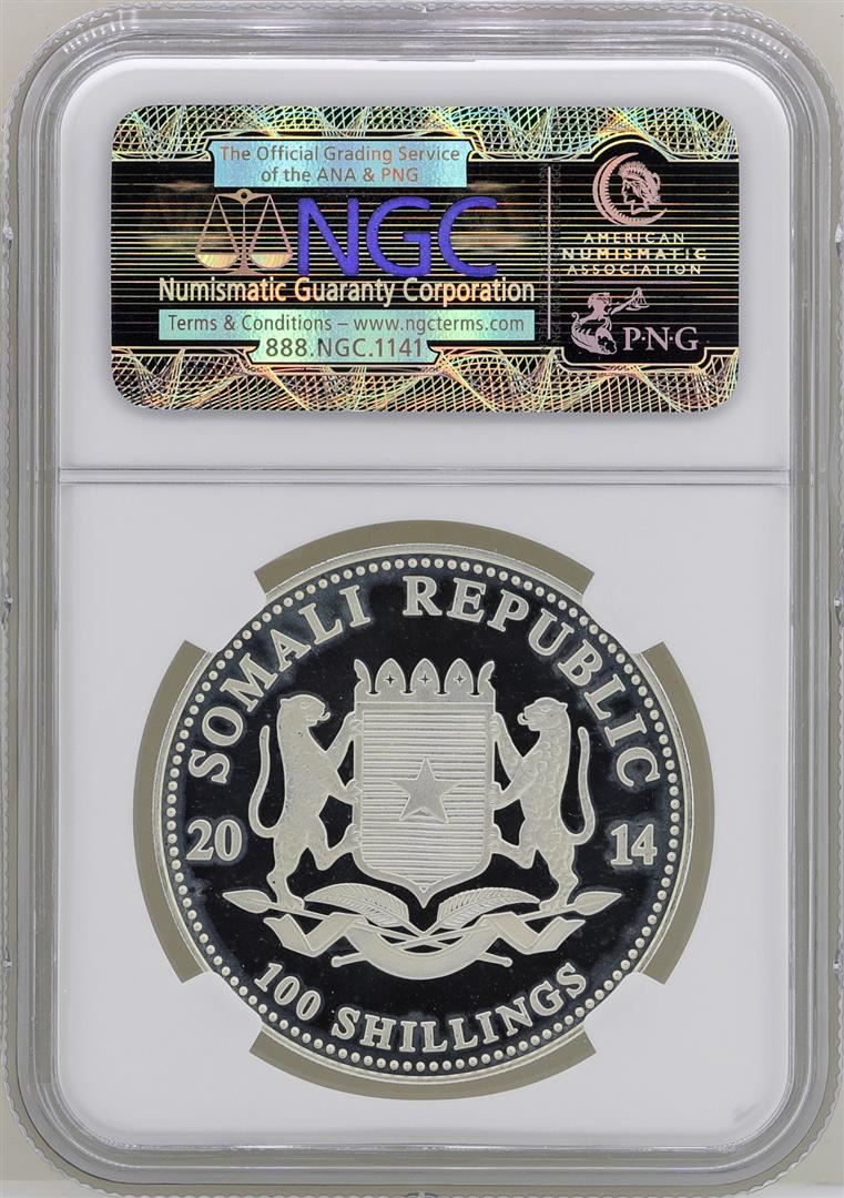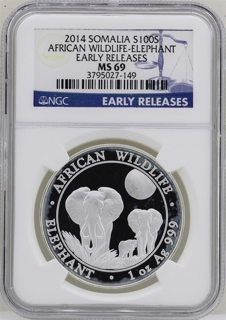 One 2014 Somalia 100 Shillings African Wildlife Elephant Silver Coin NGC MS69 ER. NGC Certified.