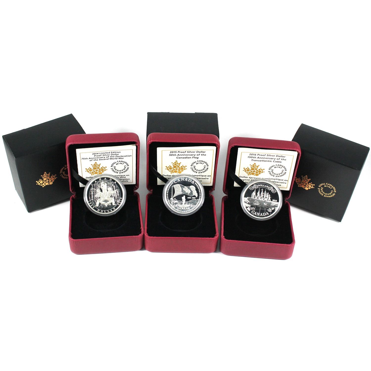2014 Special edition Declaration of WWII, 2015 & 2016 Canada Proof Commemorative Silver dollars ( Tax Exempt). 3pcs