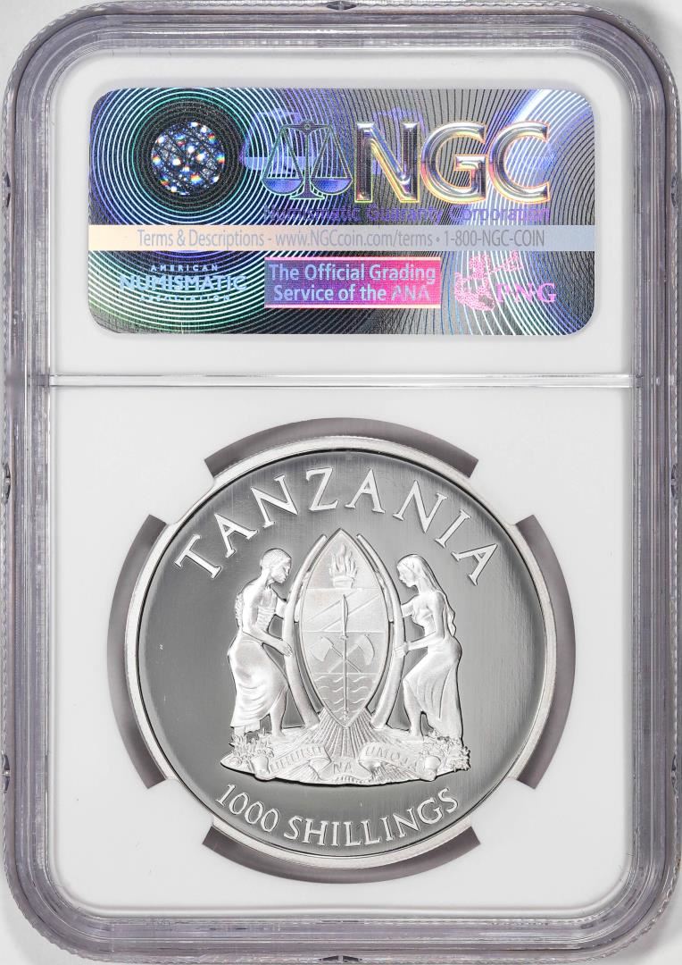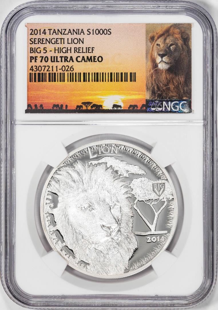 One 2014 Tanzania 1000 Shillings Serengeti Lion Big 5 HR Silver Coin NGC PF70 Ultra Cameo. NGC Certified.