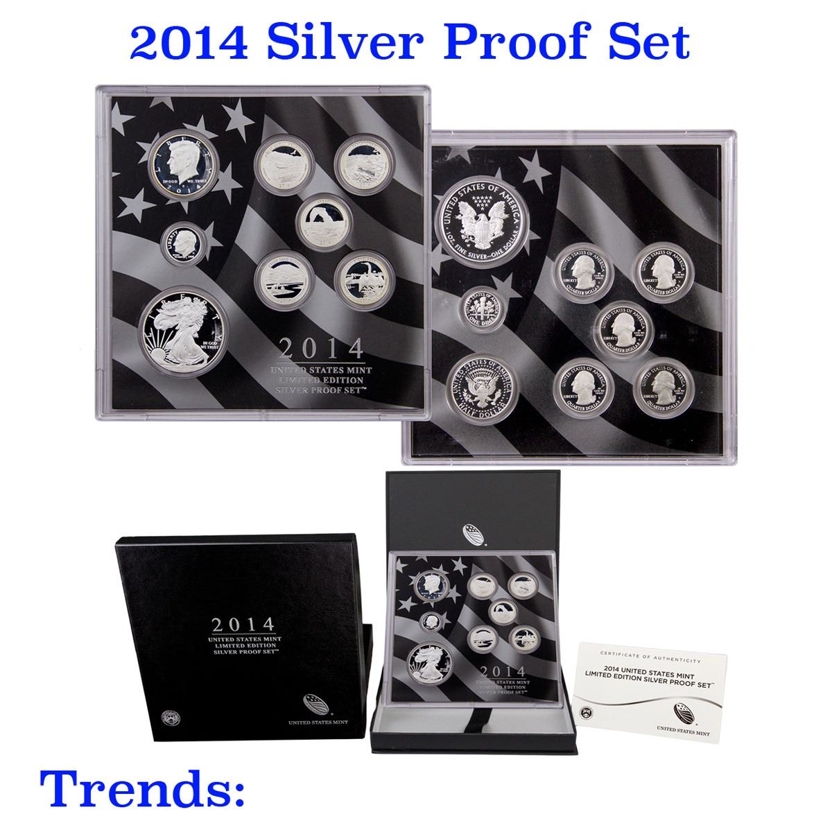 2014 United States Mint Limited Edition Silver Proof Set 8 coins. 2014 United States Mint Limited Edition Silver Proof Set contains eight silver coins, the 5 2014-S National Parks quarters (Great Smoky Mountains, Shenandoah, Arches, Great Sand Dunes, Everglades) , as well as a 2014-S Roosevelt dime, 2014-S JFK half dollar and 2014-W Proof Silver Eagle. Limited mintage of only 50,000 sets. Please note, due to the mint's packaging, these sets will have some light toning at the edge of the coins.