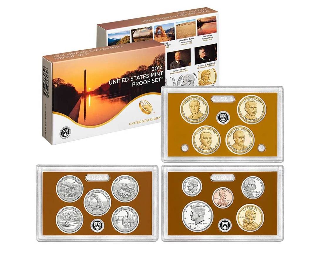 2014 United States Mint Proof Set; 14 pcs . With the U.S. Mint 2014 Proof Coin Set you get all 14 proof coins dated 2014 encased in three clear plastic lenses and newly designed packaging. The 2014 edition of the United States Mint Proof Coin Set includes the following coins: The fifth annual release of five quarters in the America the Beautiful Quarters Program which include Great Smokey Mountains National Park in Tennessee, Shenandoah National Park in Virginia, Arches National Park in Utah, Great Sand Dunes National Park in Colorado, and Everglades Natioonal Park in Florida. The eighth annual release of four coins in the Presidential $1 Coin Program including, Warren G. Harding, Calvin Coolidge, Herbert Hoover, and Franklin D. Roosevelt. A Sacajawea $1 Coin, a Kennedy half dollar, a Roosevelt dime, a Jefferson nickel, and a Lincoln penny. With sharp relief and mirror-like backgrounds, U.S. Mint proof coins have frosted, sculpted foregrounds giving them a special cameo effect. A beautiful mint issued set in the original packaging with the certificate of authenticity.