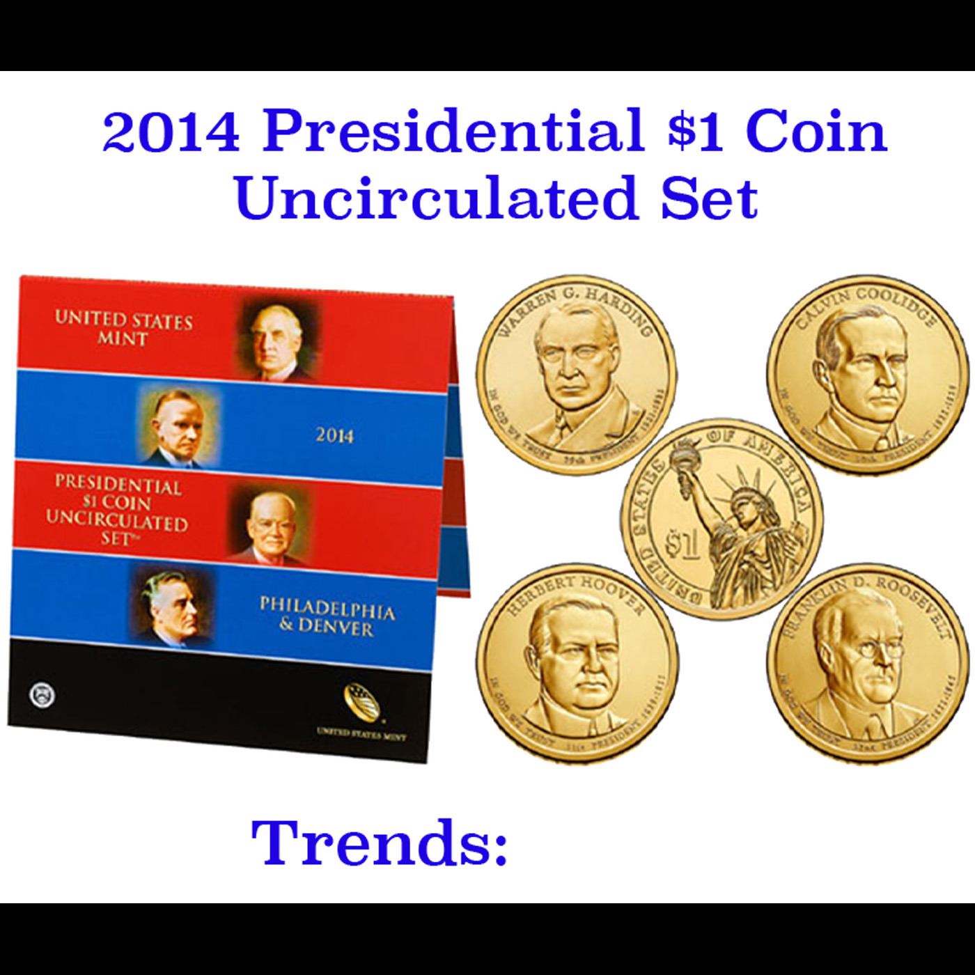 2014 United States Presidential Mint Set 8 Coins. This eight-coin set features four uncirculated Presidential $1 Coins from the United States Mint at Philadelphia and four uncirculated Presidential $1 Coins from the United States Mint at Denver. Each The dollar coins has a common reverse (tails side) design featuring a striking rendition of the Statue of Liberty. These 2014 coins feature large, dramatic artwork, as well as edge-incused inscriptions of the year of minting or issuance, E PLURIBUS UNUM and the mint mark. IN GOD WE TRUST appears on the face of the coin. The 2014 obverses (heads sides) of these coins honor these Presidents: Warren G. Harding: This design features an image of Warren G. Harding with the inscriptions WARREN G. HARDING, IN GOD WE TRUST, 29th PRESIDENT and 1921-1923. Calvin Coolidge: This design features an image of Calvin Coolidge with the inscriptions CALVIN COOLIDGE, IN GOD WE TRUST, 30th PRESIDENT and 1923-1929. Herbert Hoover: This design features an image of Herbert Hoover with the inscriptions HERBERT HOOVER, IN GOD WE TRUST, 31st PRESIDENT and 1929-1933. Franklin D. Roosevelt: This design features an image of Franklin D. Roosevelt with the inscriptions FRANKLIN D. ROOSEVELT, IN GOD WE TRUST, 32nd PRESIDENT and 1933-1945.