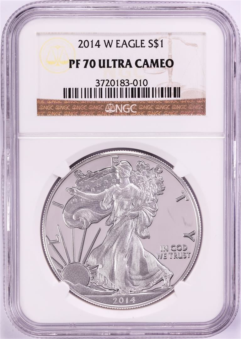 One 2014-W $1 Proof American Silver Eagle Coin NGC PF70 Ultra Cameo. NGC Certified.