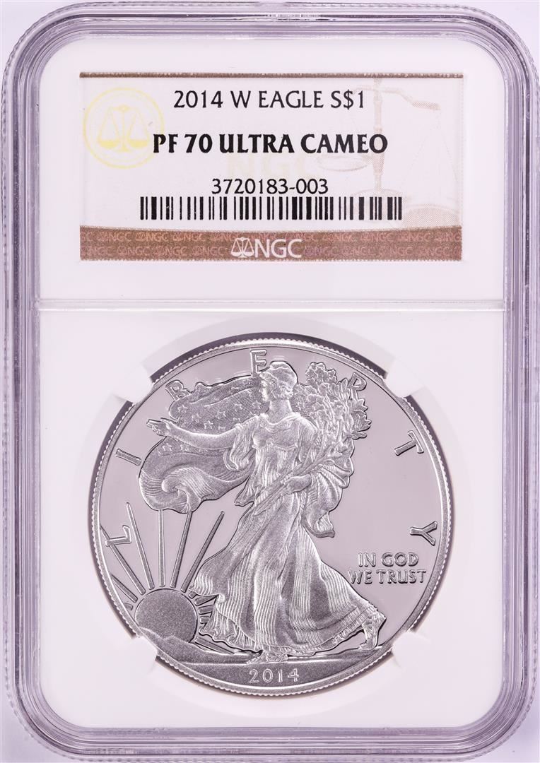 One 2014-W $1 Proof American Silver Eagle Coin NGC PF70 Ultra Cameo. NGC Certified.