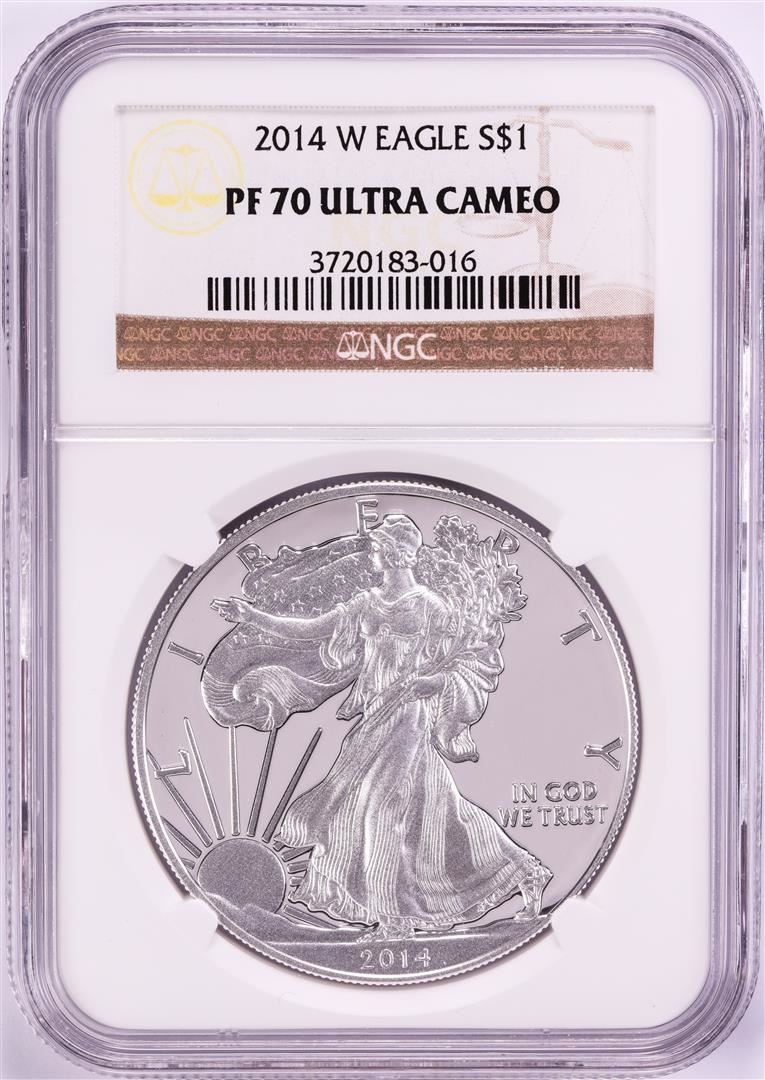 One 2014-W $1 Proof American Silver Eagle Coin NGC PF70 Ultra Cameo. NGC Certified.