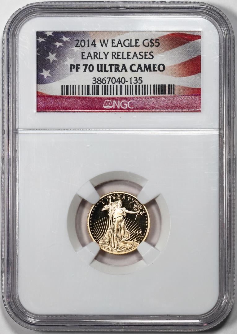 One 2014-W $5 Proof American Gold Eagle Coin NGC PF70 Ultra Cameo Early Releases. NGC Certified.