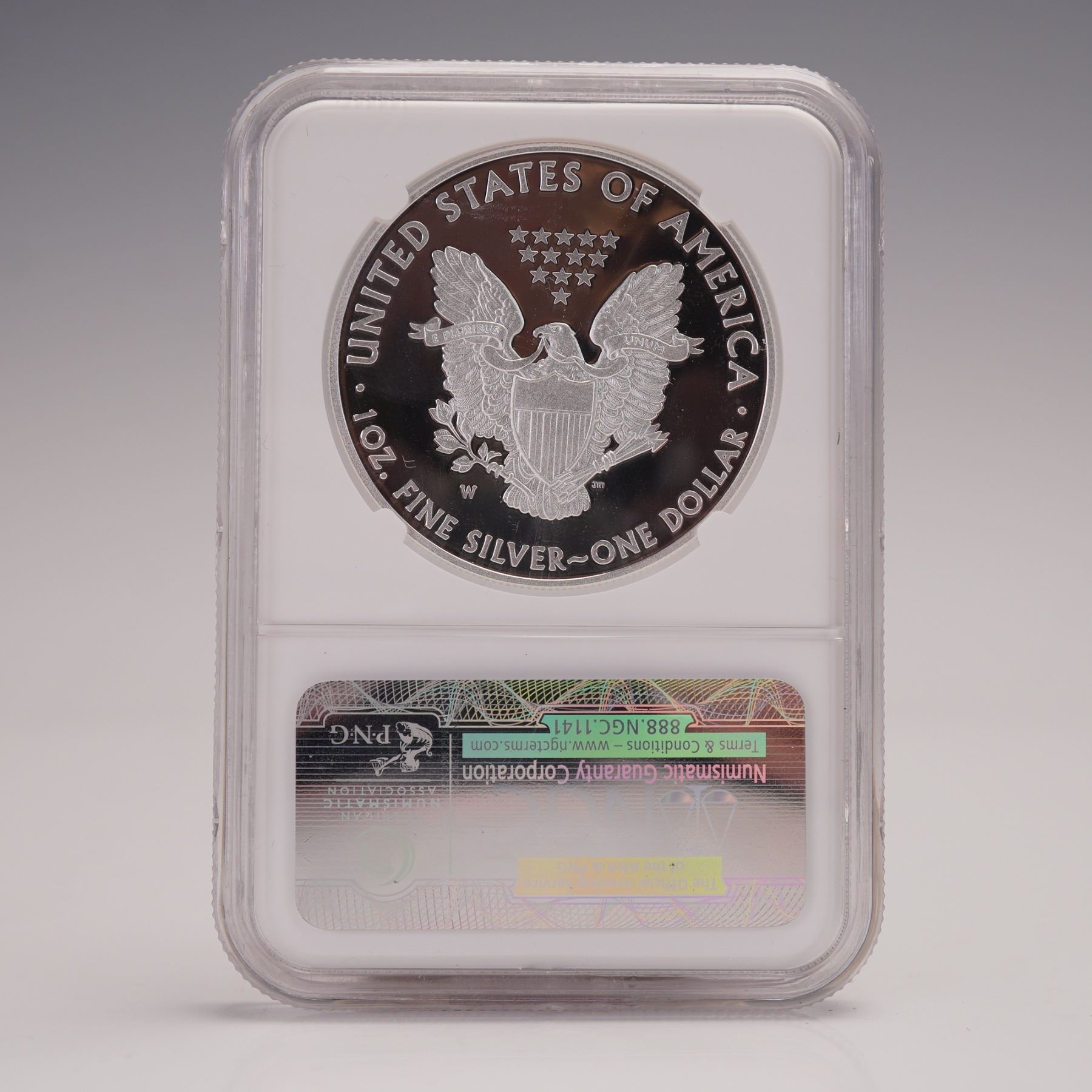 Certified by NGC as Proof 70 Ultra Cameo and encapsulated with a label hand-signed by Elizabeth Jones, the 11th Chief Engraver of the United States Mint. Struck at the West Point Mint in one troy ounce of .999 fine silver. The obverse carries Adolph A. Weinman's celebrated Walking Liberty design while the reverse presents John Mercanti's Heraldic Eagle. Marked with "W" mintmark. Encapsulation includes certification number.