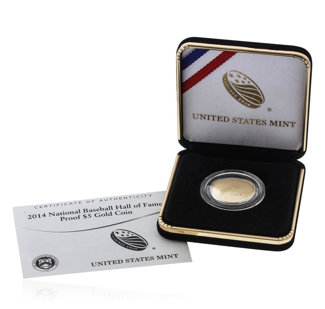 This coin was recently delivered by the US Mint will come in it's original US Mint box with Certificate of Authenticity. (1) 2014 National Baseball Hall of Fame Proof $5 22 carat Gold Coin (B31) from the United States Mint the coin weighing 8.359 grams. This coin would make a great collectible for any baseball or coin collector!
