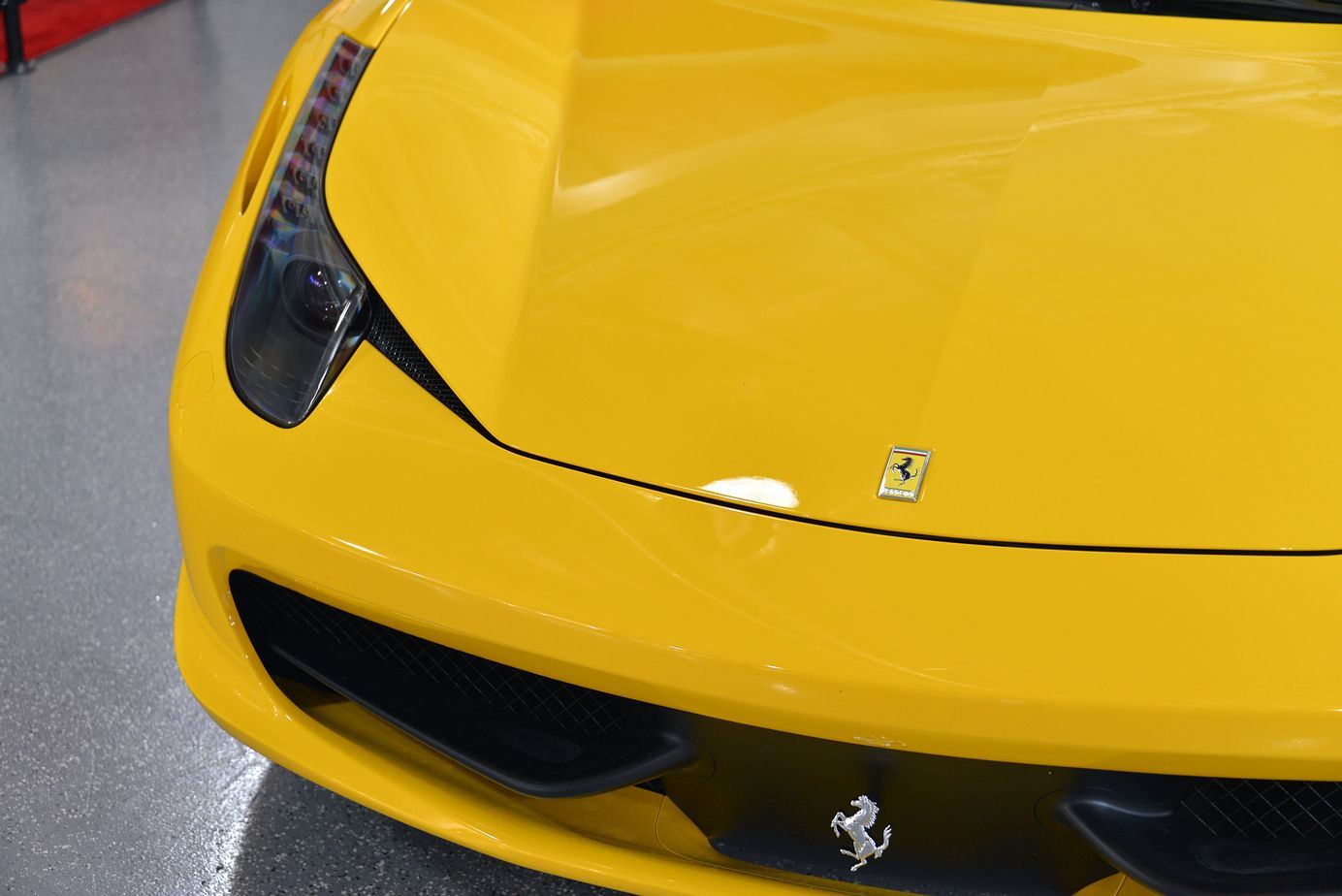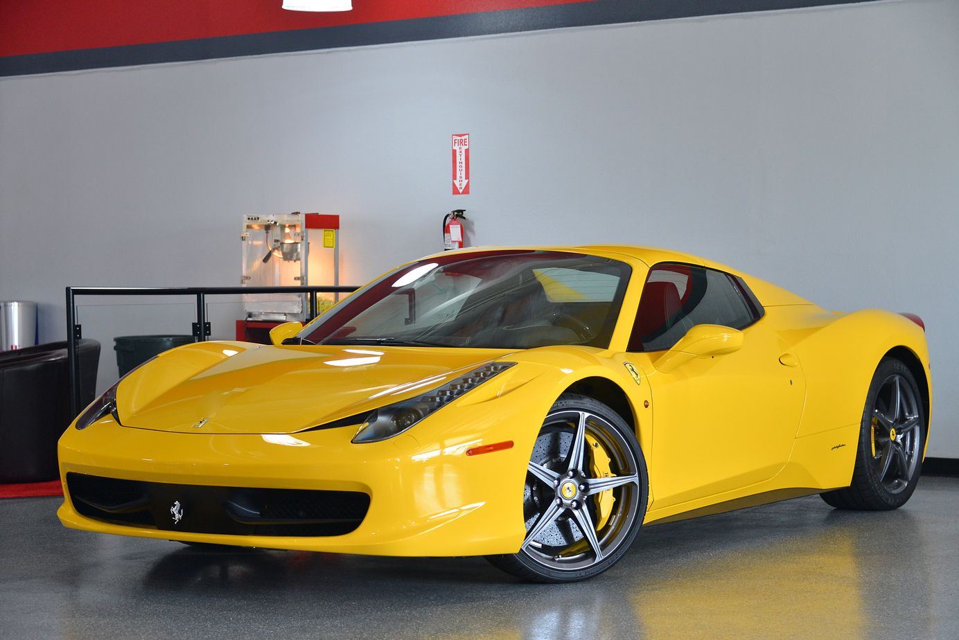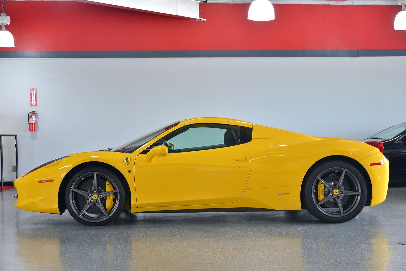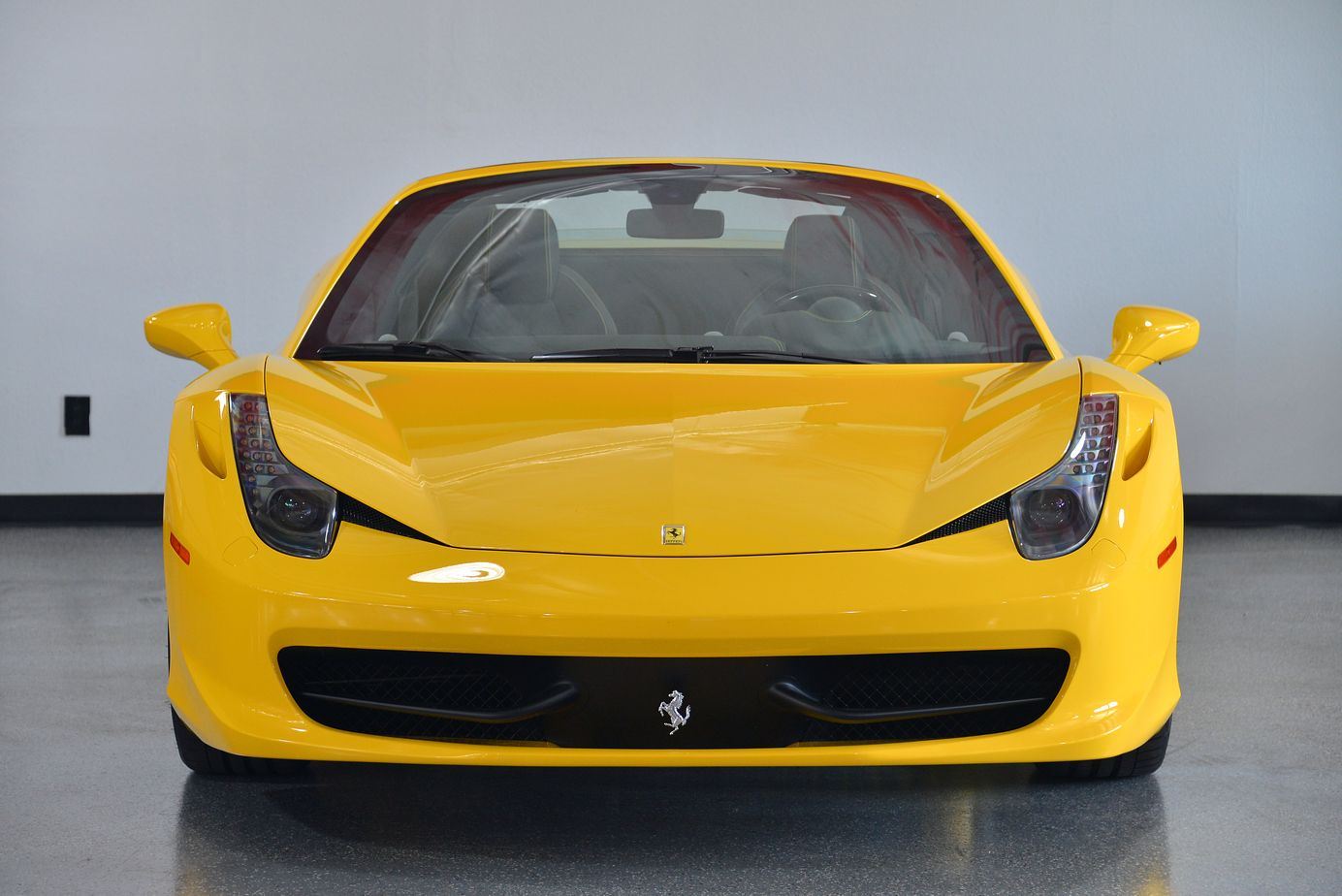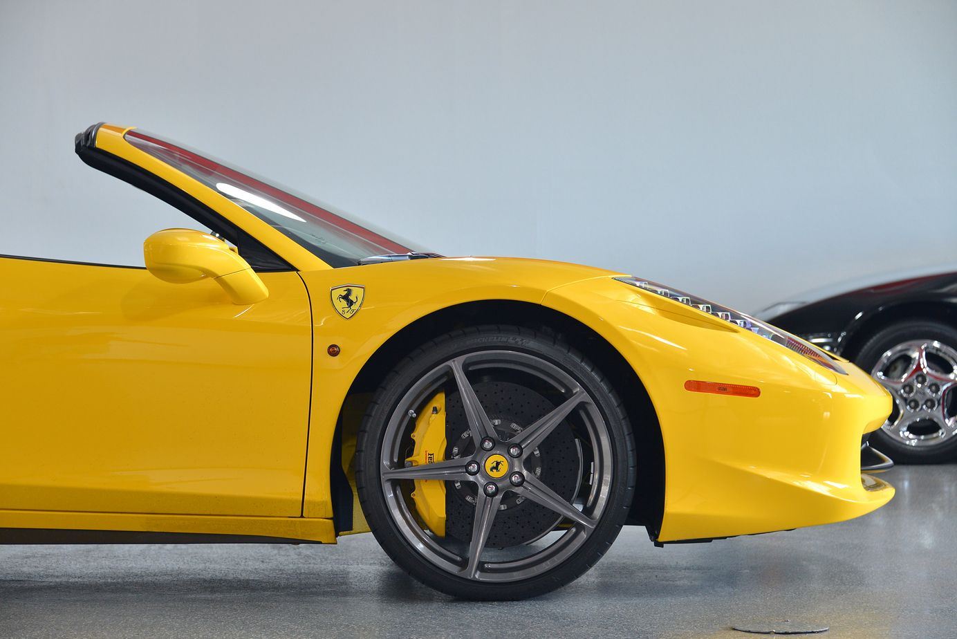 This 2014 Yellow Ferrari 458 Spider Base Convertible has a 4.5L V-8 cyl engine and 7 speed automatic with auto-shift transmission and rear-wheel drive. It recieves an average of 13 city MPG and 17 highway MPG. Vin #ZFF68NHA3E0198840.