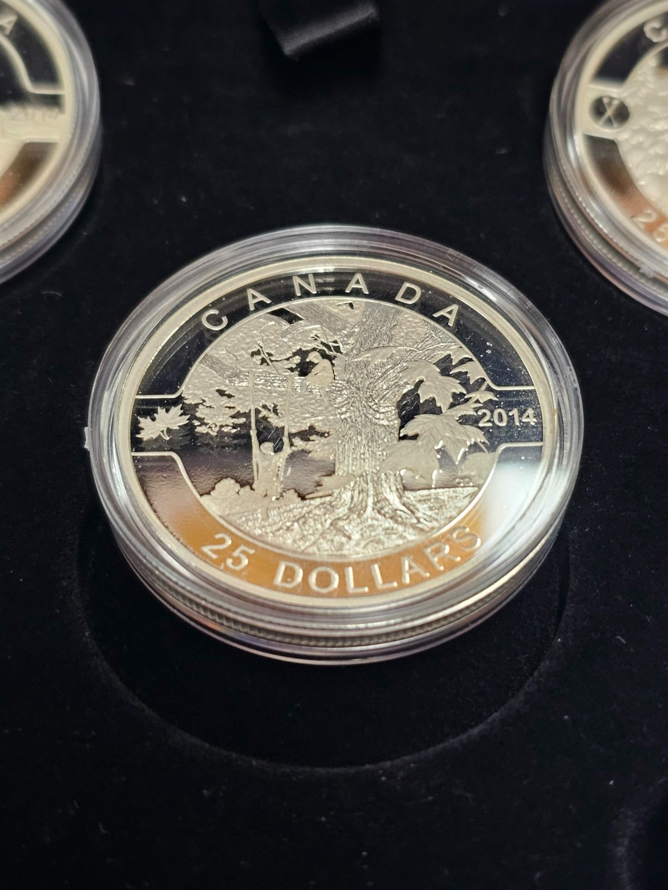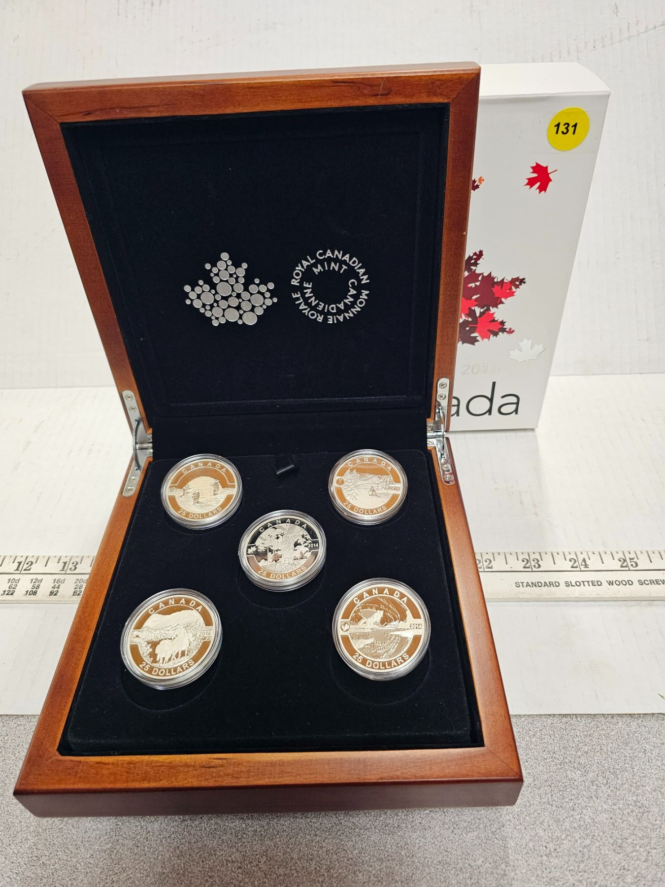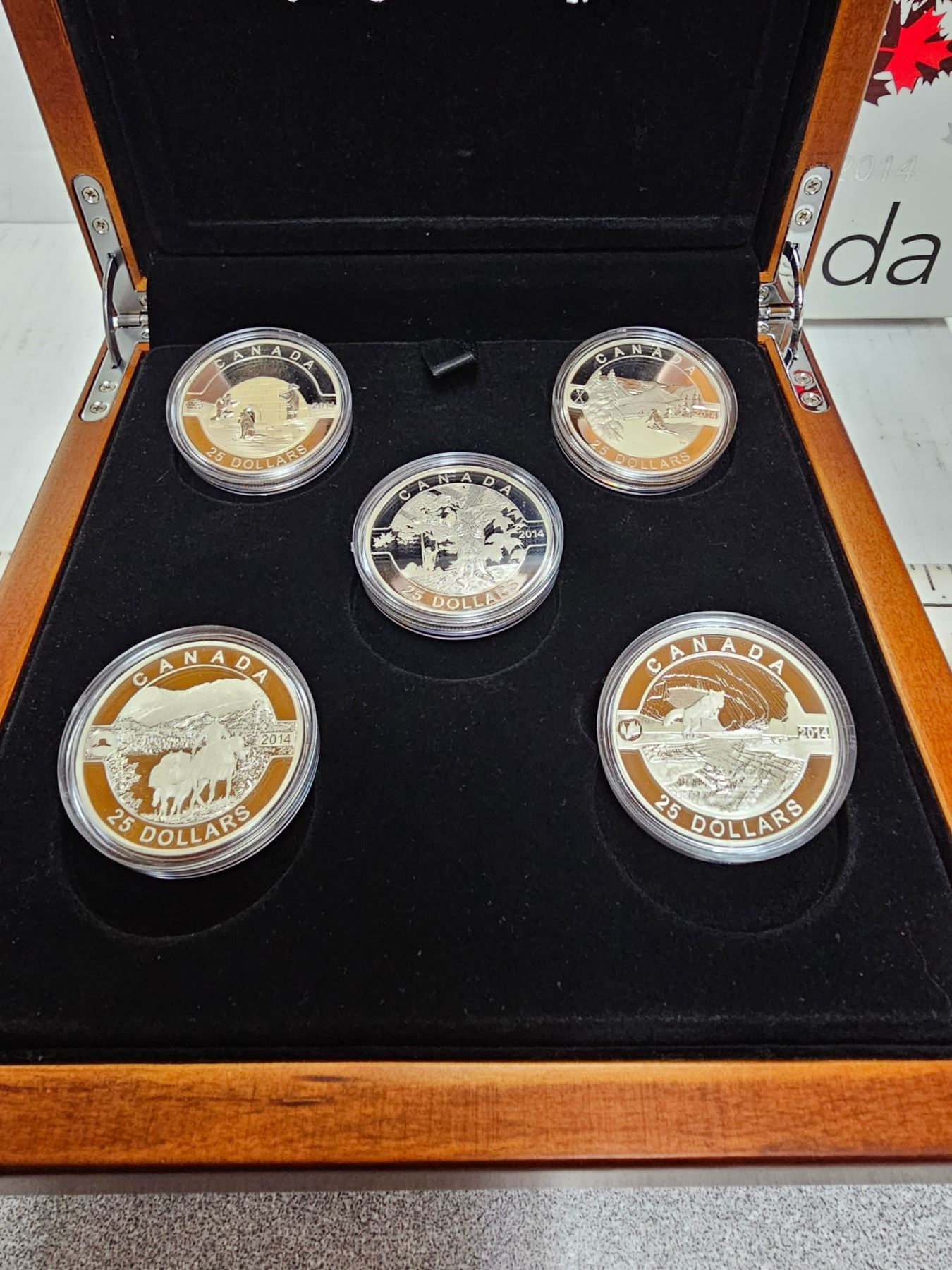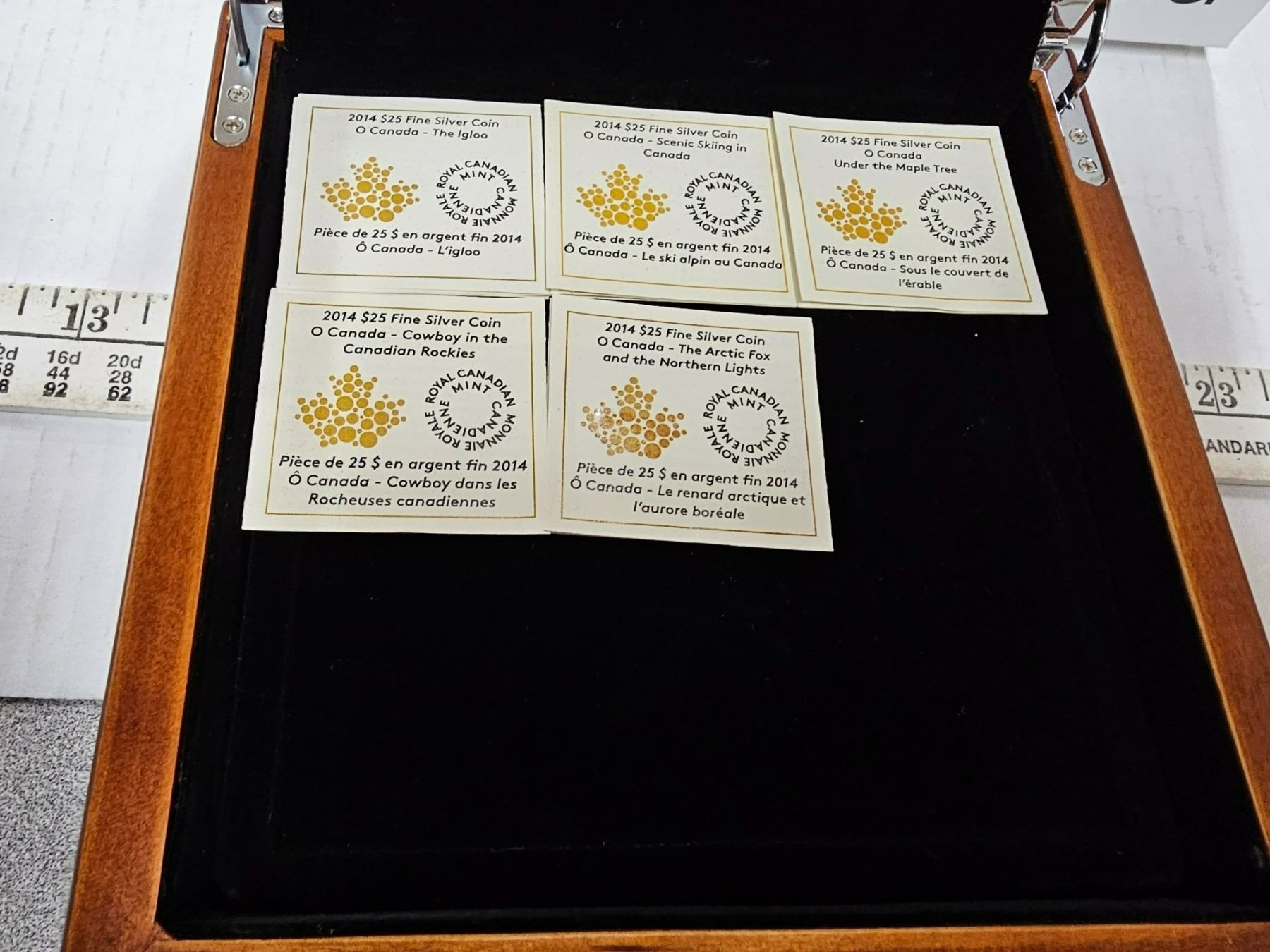 2014 complete set of 5 $25 o canada. Includes Lgloo, scenic skiing in canada, under the maple tree, cowboy rockies & the arctic fox and the nirthern lights. Each coin is 99.99% pure silver. Proof with ultra cameo. Housed in its original royal canadian mint case & box of issue, along with a certificate of authenticity