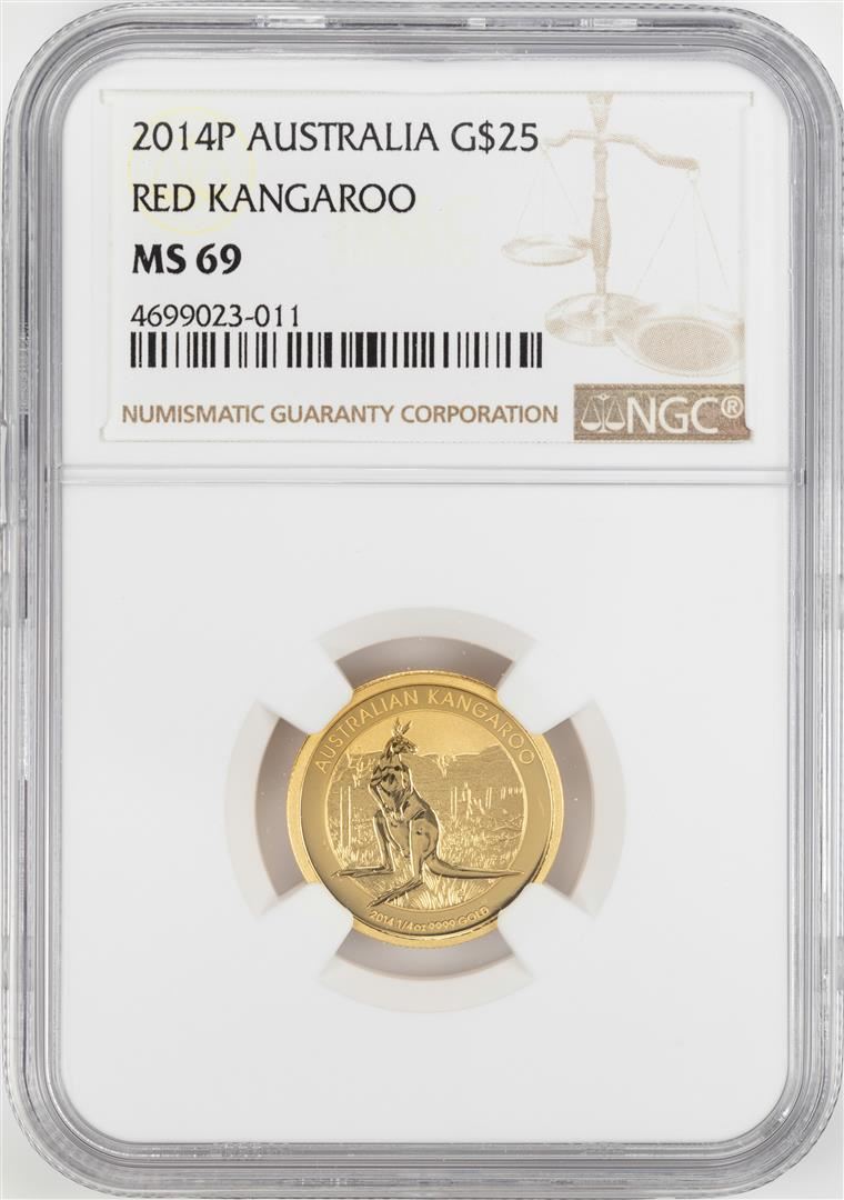 One 2014P $25 Australia Red Kangaroo Gold Coin NGC MS69. NGC Certified.