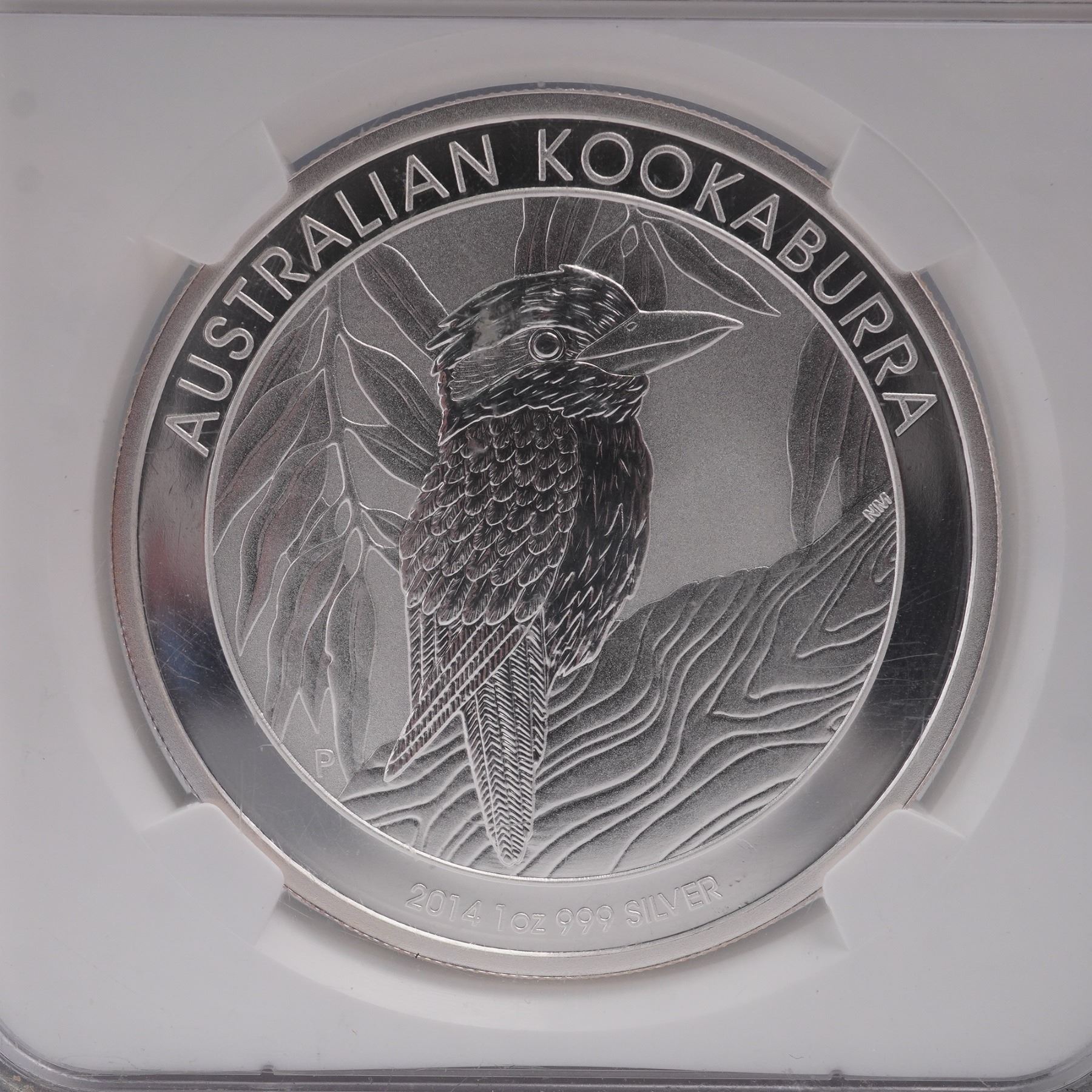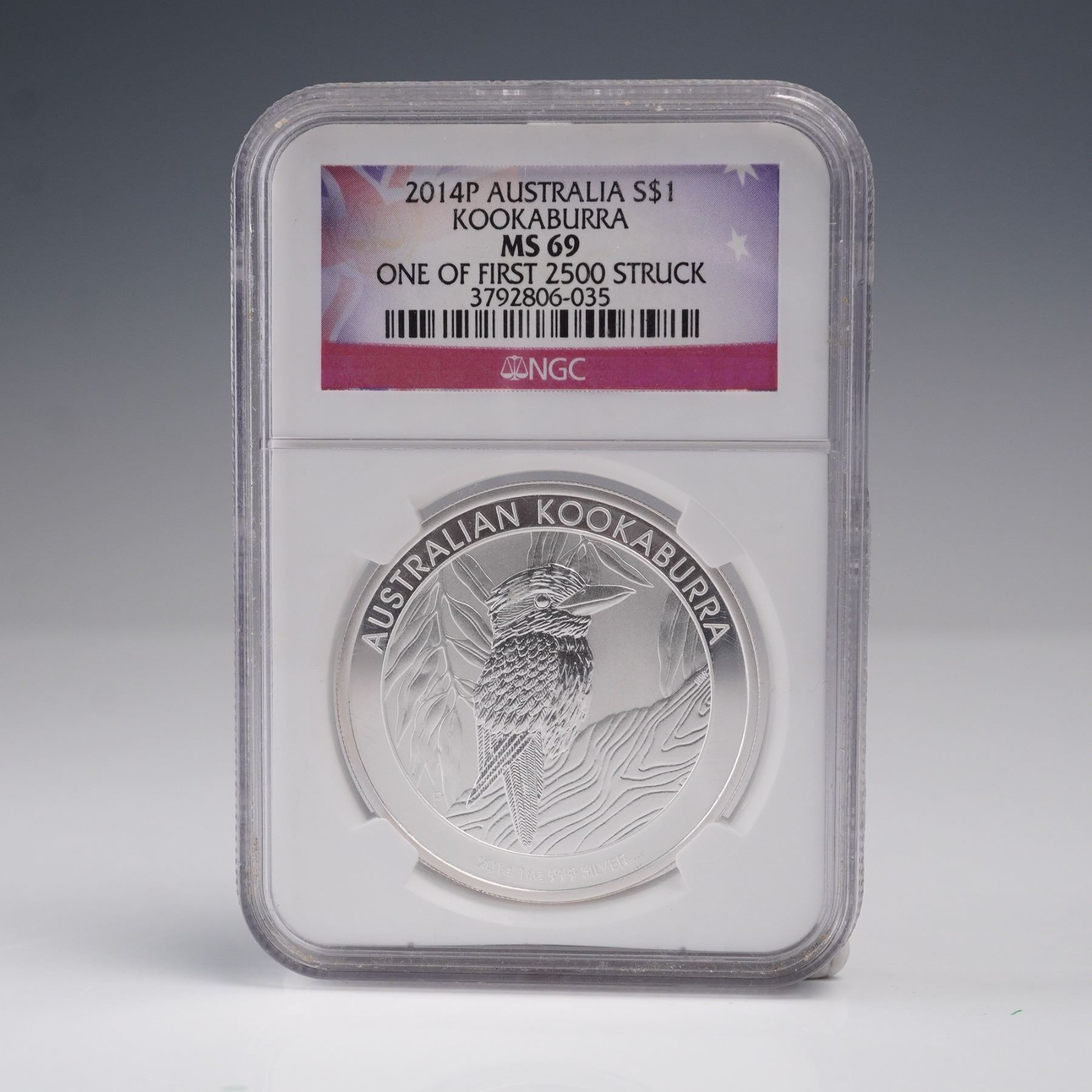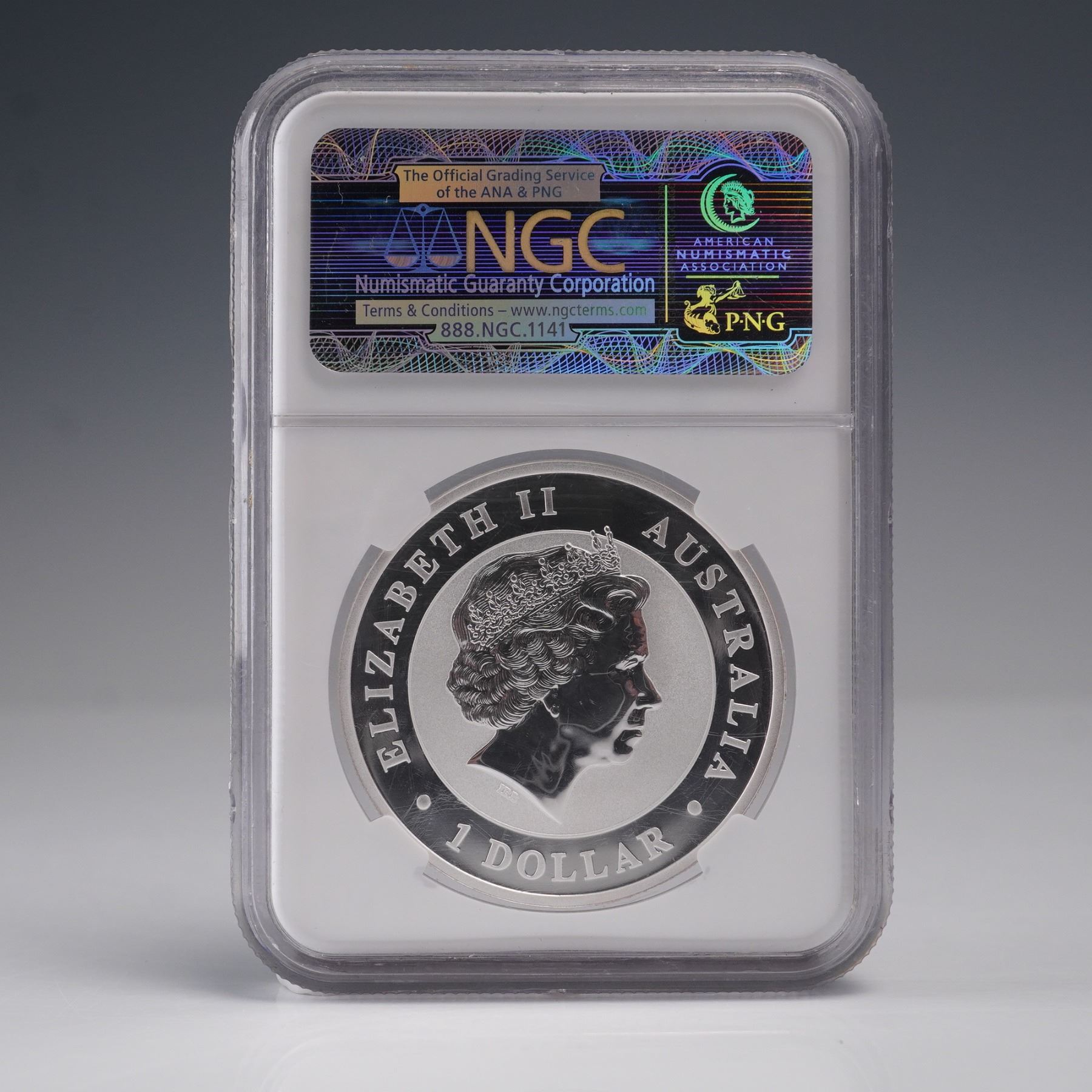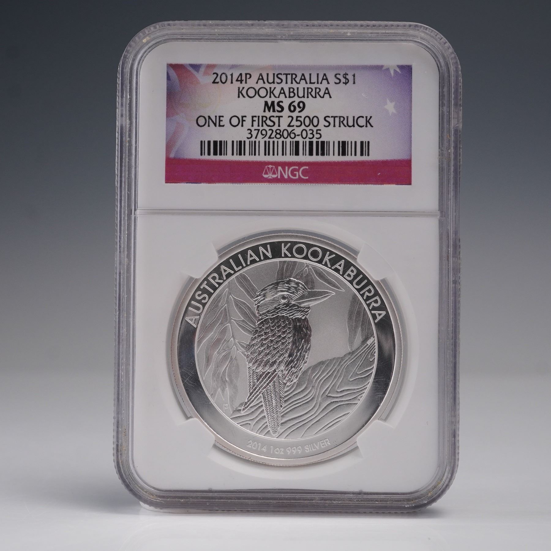 This 2014P Australia one dollar coin bearing the Perth Mint's distinctive 'P' mintmark. Design in one troy ounce of .999 fine silver and graded MS 69 by NGC. One side features the iconic Kookaburra surrounded by "AUSTRALIAN KOOKABURRA" at the top and "2014 1oz 999 SILVER" on the bottom. The other side presents a regal effigy of Queen Elizabeth II, accompanied by inscriptions denoting her name, the issuing nation of Australia, and the denomination. Housed in a slab for authentication and further preservation. Slab measures: 2.25"L x 0.25"W x 3.25"H. Coin diameter: 40.6 mm.