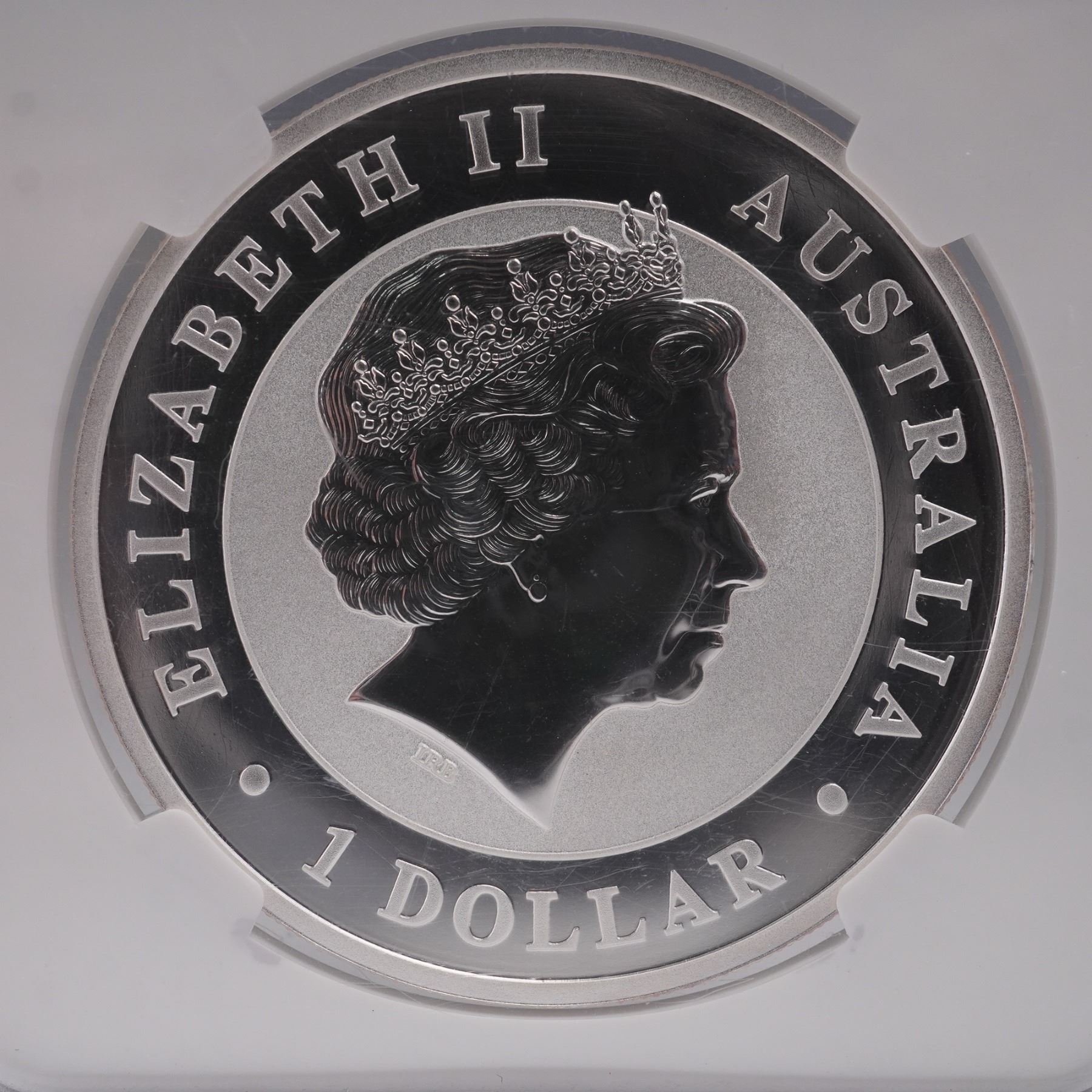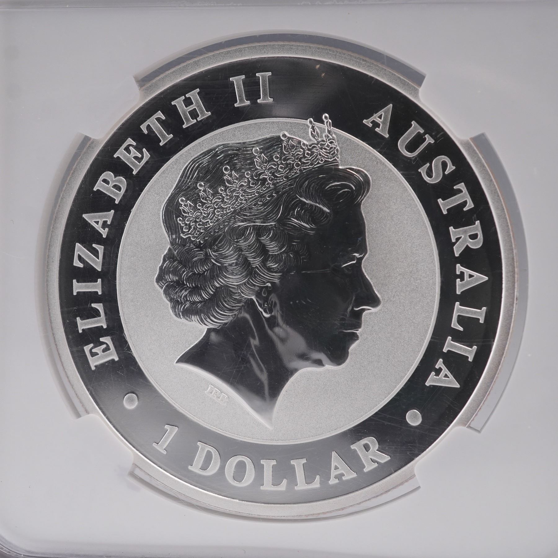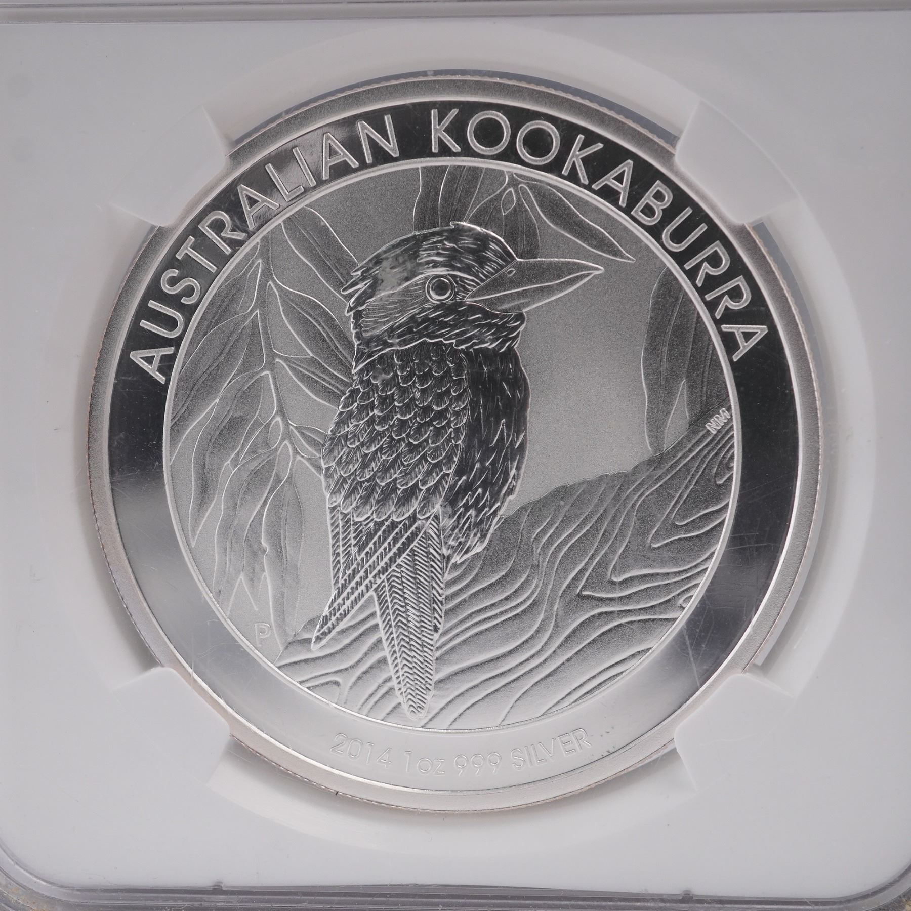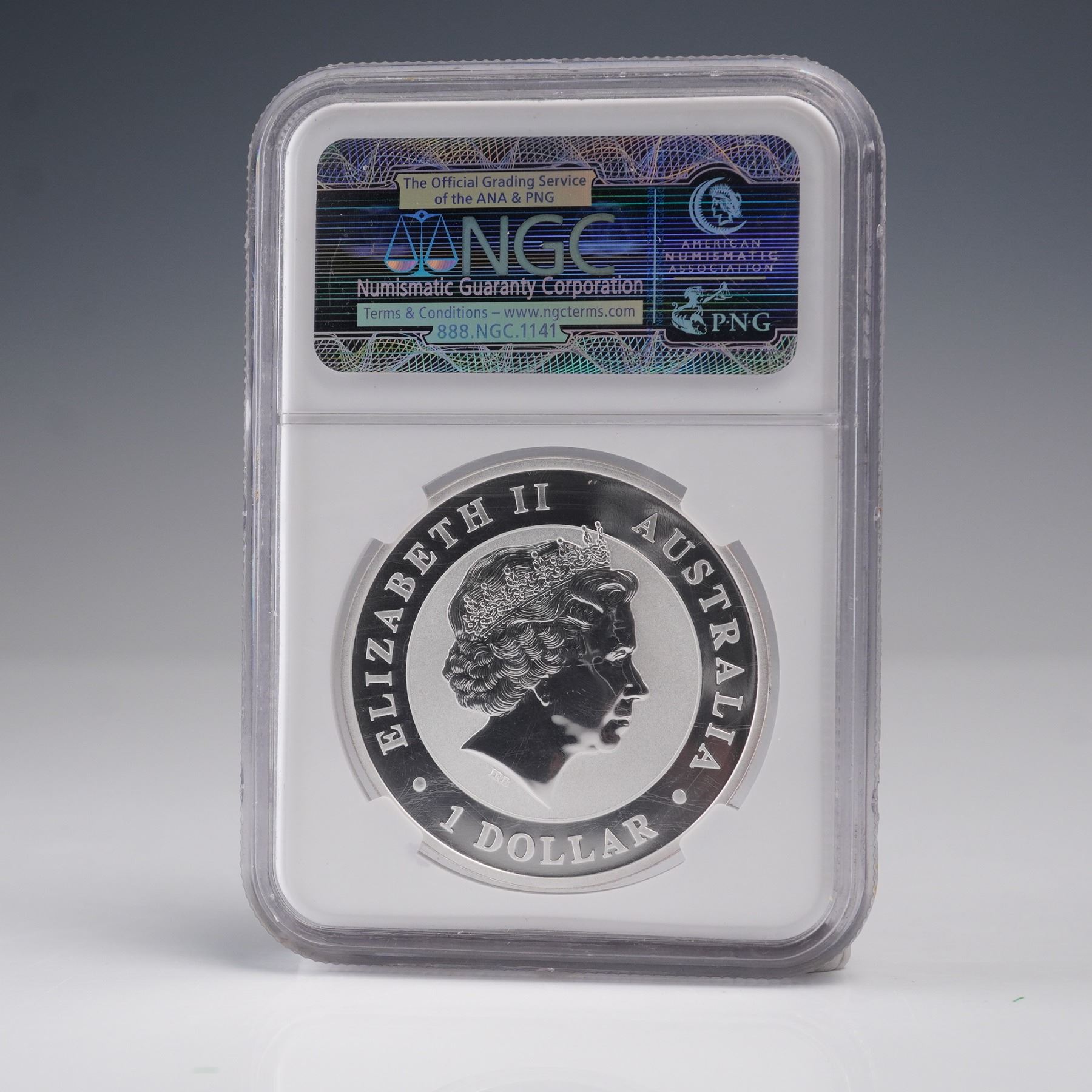 This 2014P Australia one dollar coin bearing the Perth Mint's distinctive 'P' mintmark. Design in one troy ounce of .999 fine silver and graded MS 69 by NGC. One side features the iconic Kookaburra surrounded by "AUSTRALIAN KOOKABURRA" at the top and "2014 1oz 999 SILVER" on the bottom. The other side presents a regal effigy of Queen Elizabeth II, accompanied by inscriptions denoting her name, the issuing nation of Australia, and the denomination. Housed in a slab for authentication and further preservation. Slab measures: 2.25"L x 0.25"W x 3.25"H. Coin diameter: 40.6 mm.