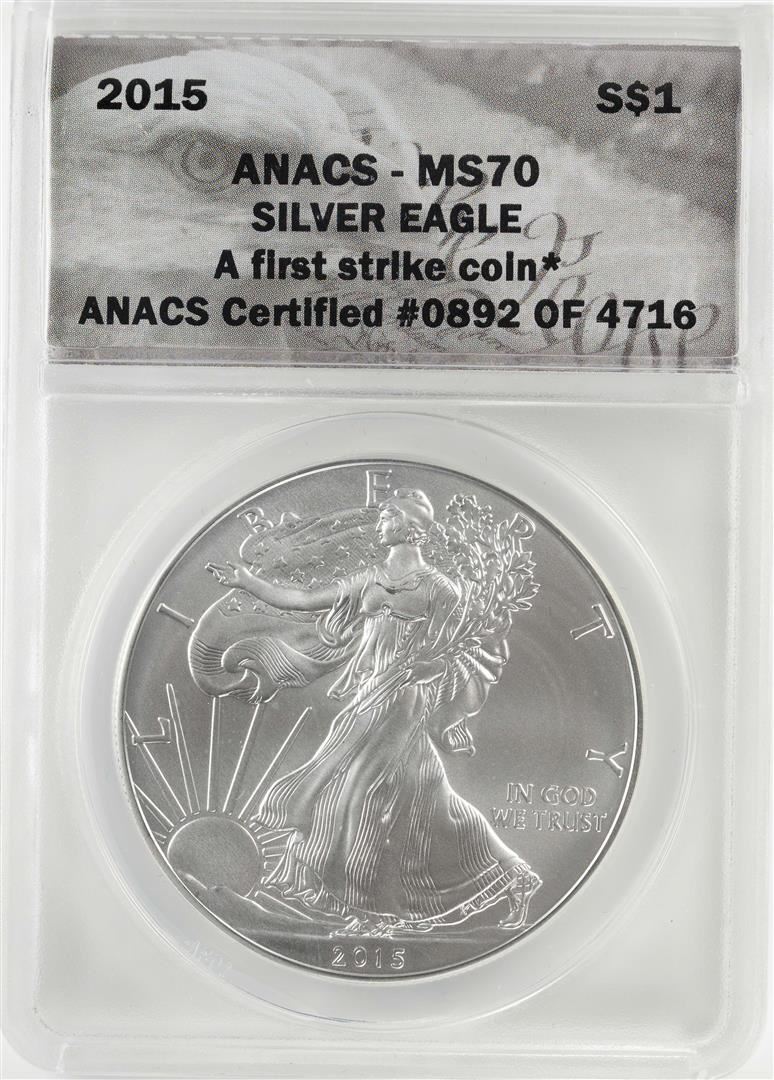 One 2015 $1 American Silver Eagle Coin ANACS MS70 First Strike. ANACS Certified.