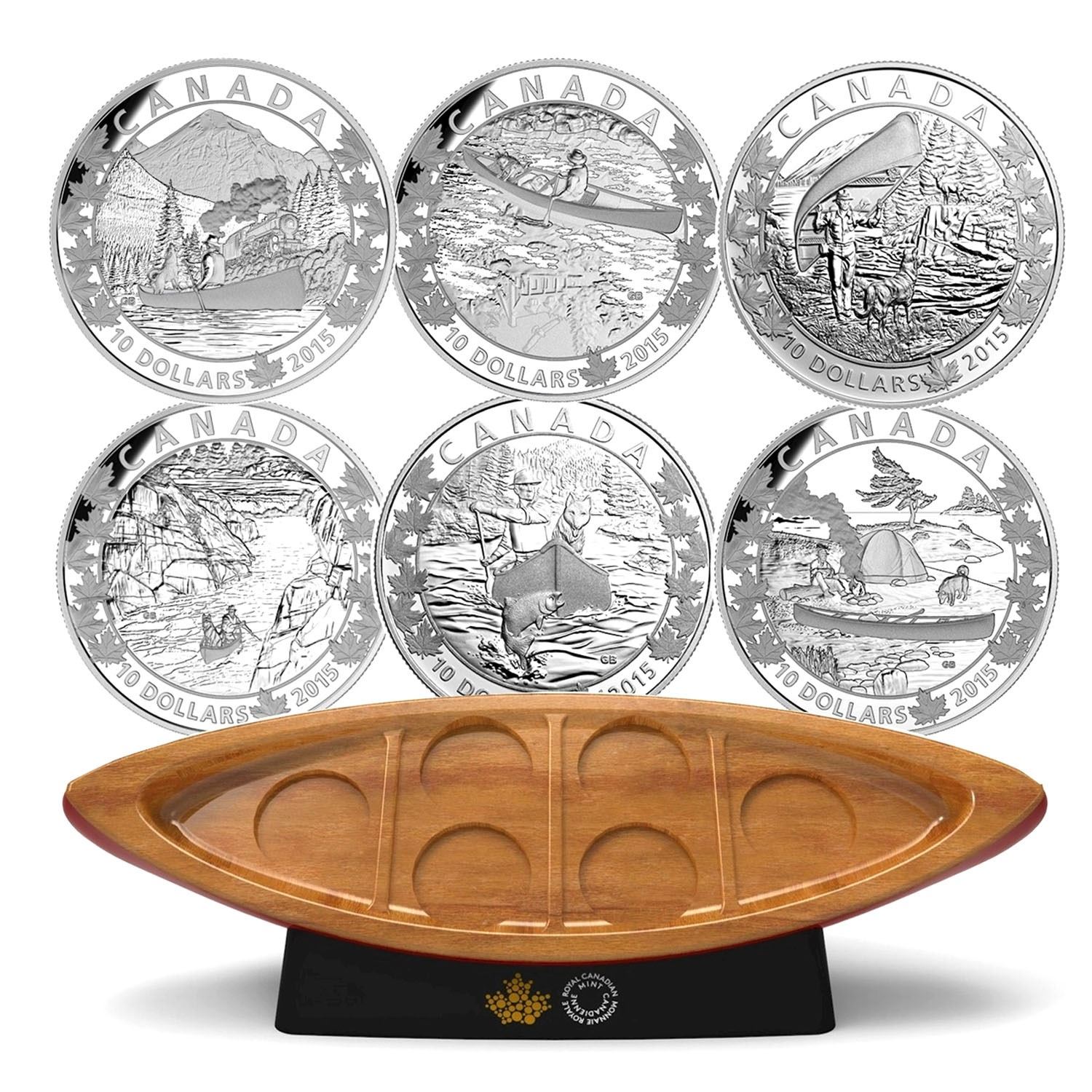 2015 $10 Canoe Across Canada 6-coin Fine Silver Set in Canoe Shaped Display (Capsules may be scuffed). TAX Exempt