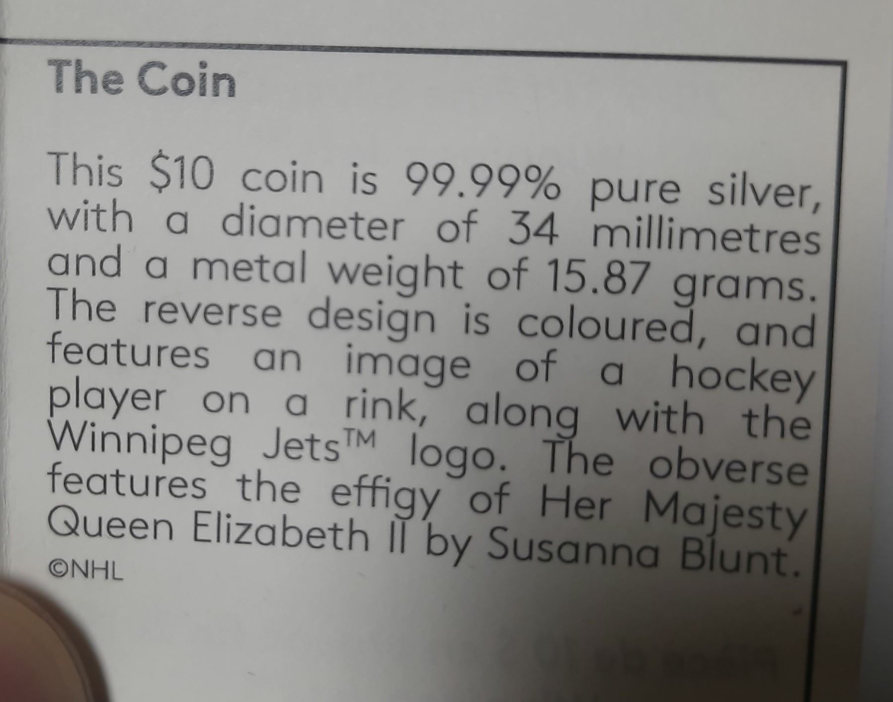 2015 $10 Fine Silver Coin Winnipeg Jets.