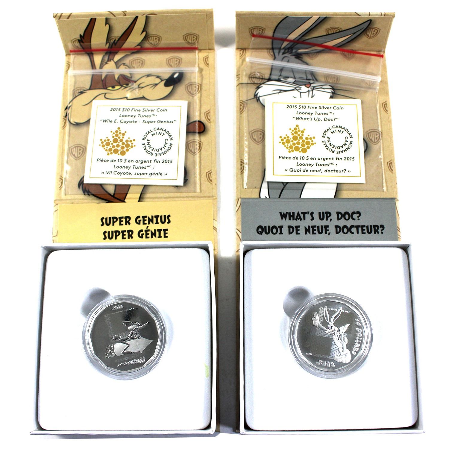 2015 $10 Looney Tunes™; "What's Up, Doc?" & Wile E. Coyote-Super Genius 1/2oz .9999 Silver Coins. Lightly toned. 2pcs. (Tax Exempt)