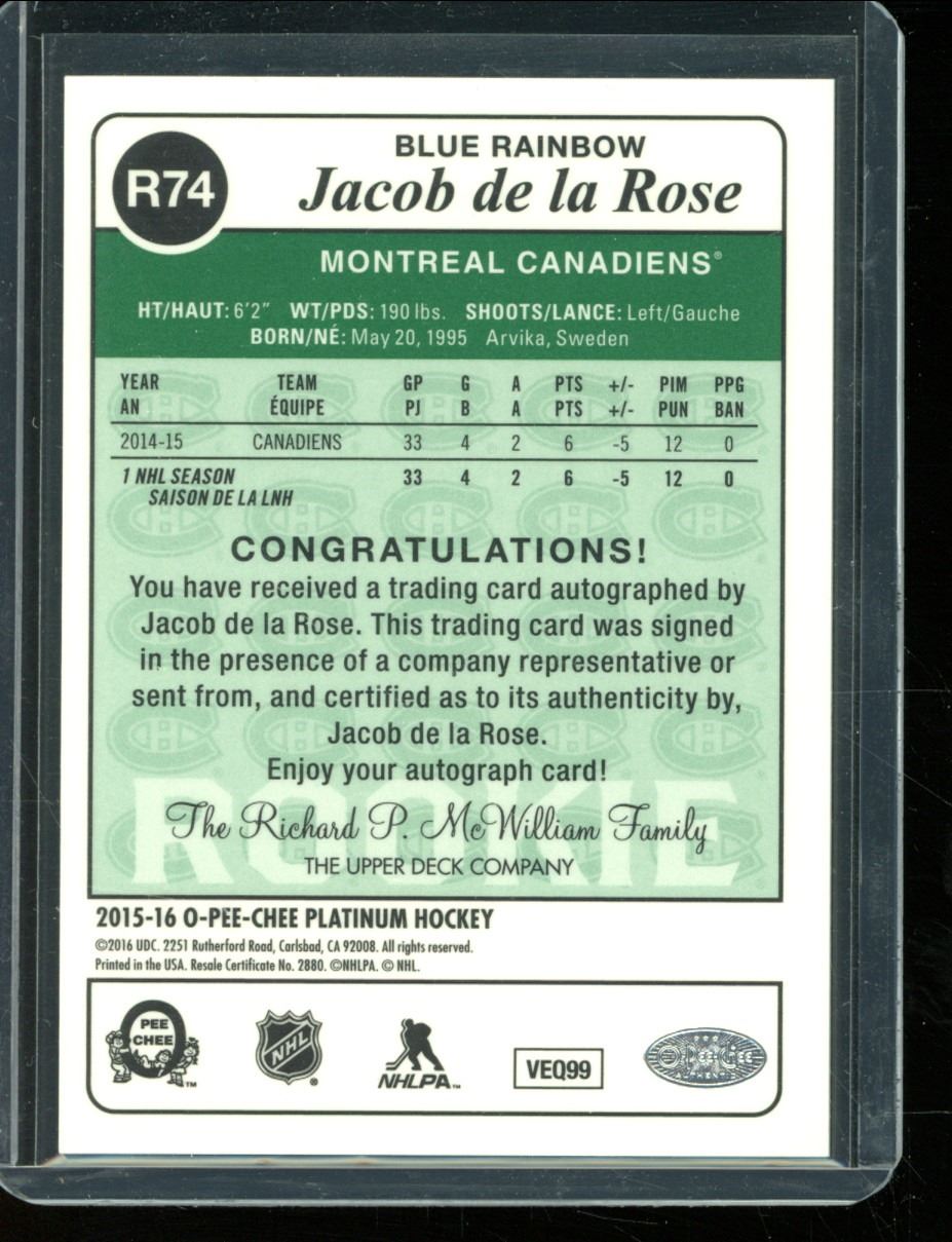 2015-16 O-Pee-Chee Platinum Retro Rainbow Blue Autographs #R74 Jacob de la Rose