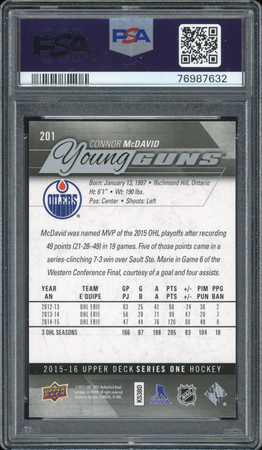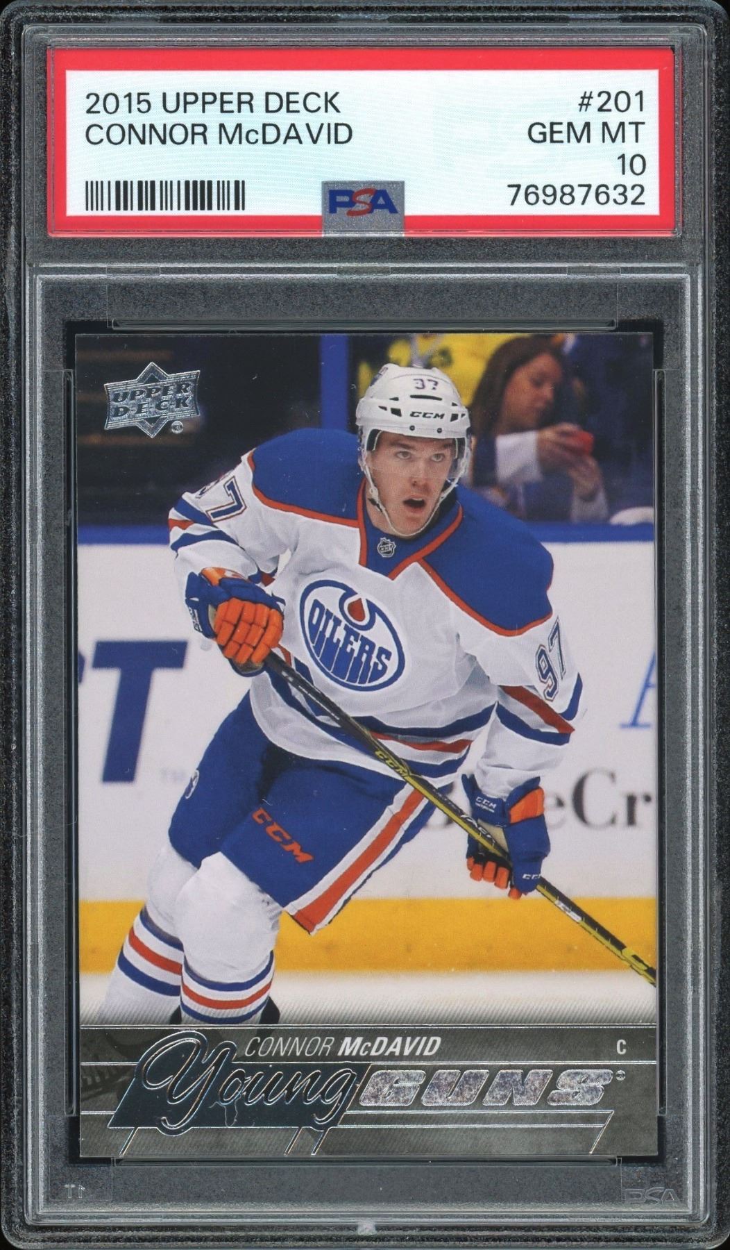 Here's the "Heir Apparent's" true Young Guns rookie card, in unimprovable condition. McDavid, the most exciting player in the game, is a superstar in his prime at only 26 years old, who has already racked up 850 pts in only 569 NHL games. This freshly slabbed example has been graded a perfect GEM MINT 10 by PSA. This card sells regularly in the $3000 or more USD range. This is offered at $3300 CDN, or about $2500 US, a sizeable discount to recent comp sales.