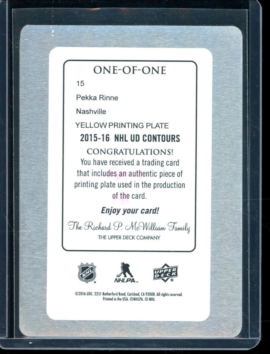 2015-16 Upper Deck Contours Printing Plates Yellow #15 Pekka Rinne 1/1 One Of One BV $85