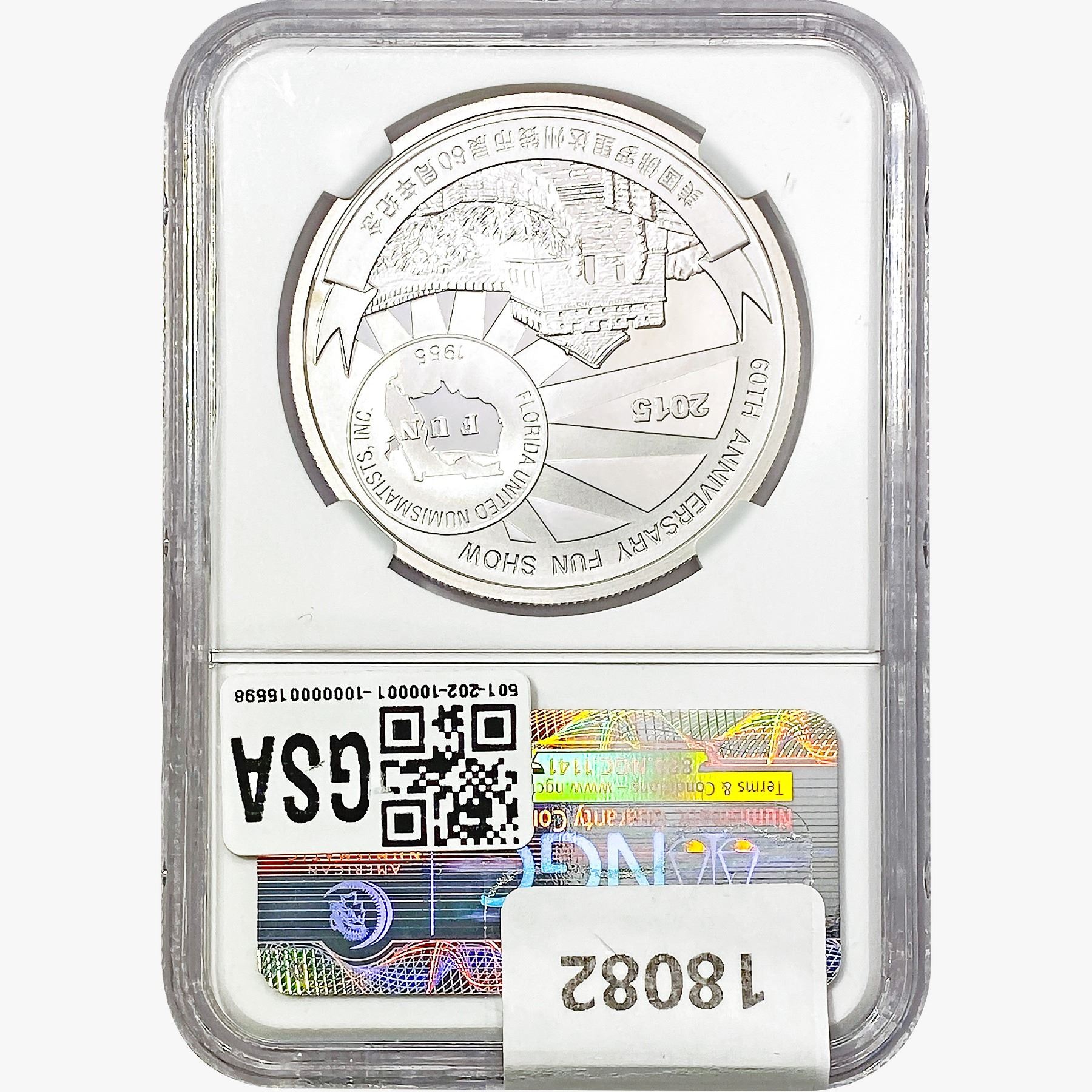 COINS AND CURRENCY LISTED IN GSA’S CATALOG AS GRADED AND ENCAPSULATED BY PCGS, NGC, ANACS, ICG, PCGS CURRENCY, PMG, PCGS BANKNOTE GRADING, CMC OR ANY OTHER THIRD-PARTY GRADING SERVICE ARE LIKEWISE SOLD “AS-IS” EXCEPT AS EXPRESSLY SET FORTH HEREIN. ALL THIRD-PARTY GRADING SERVICE GUARANTEES, INCLUDING AUTHENTICITY, ARE THE SOLE RESPONSIBILITY OF THE THIRD-PARTY GRADING SERVICE AND NOT WARRANTIES OR GUARANTEES OF GSA. BIDDERS SHOULD CONTACT THESE THIRD-PARTY GRADING SERVICES DIRECTLY WITH RESPECT TO ANY CLAIMS OR QUESTIONS THEY MAY HAVE CONCERNING THEIR GUARANTEES AND WARRANTIES. BIDDERS ACKNOWLEDGE AND AGREE THAT AUCTIONEER IS NOT BOUND BY OR LIABLE FOR ANY OPINION OR CERTIFICATION BY ANY THIRD-PARTY GRADING SERVICE. REMOVAL OF A PRODUCT FROM ITS PROTECTIVE CASING OR HOLDER OR ALTERATION OF ANY COIN HOLDER WAIVES ALL RIGHTS CONCERNING THE PRODUCT CONTAINED THEREIN.