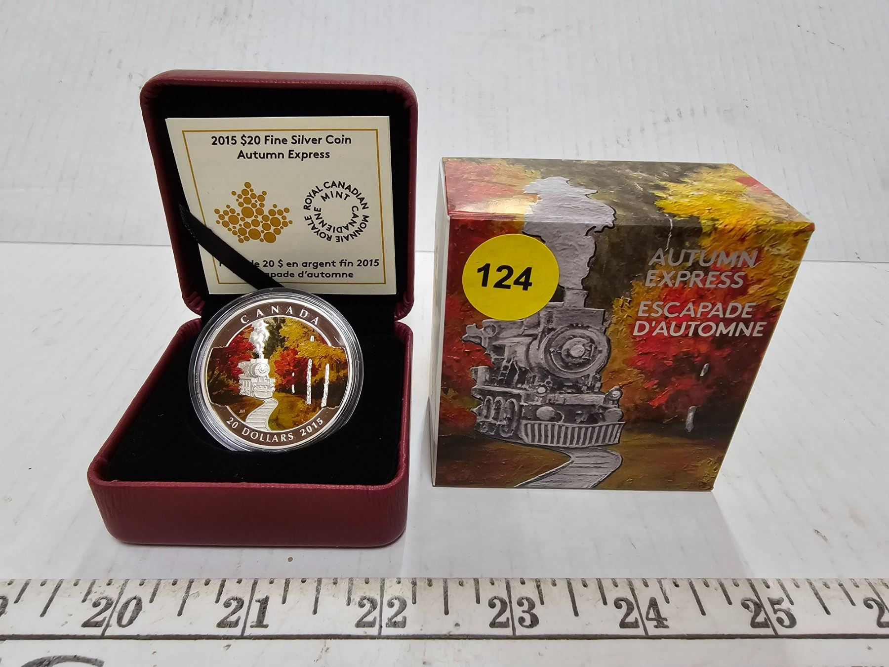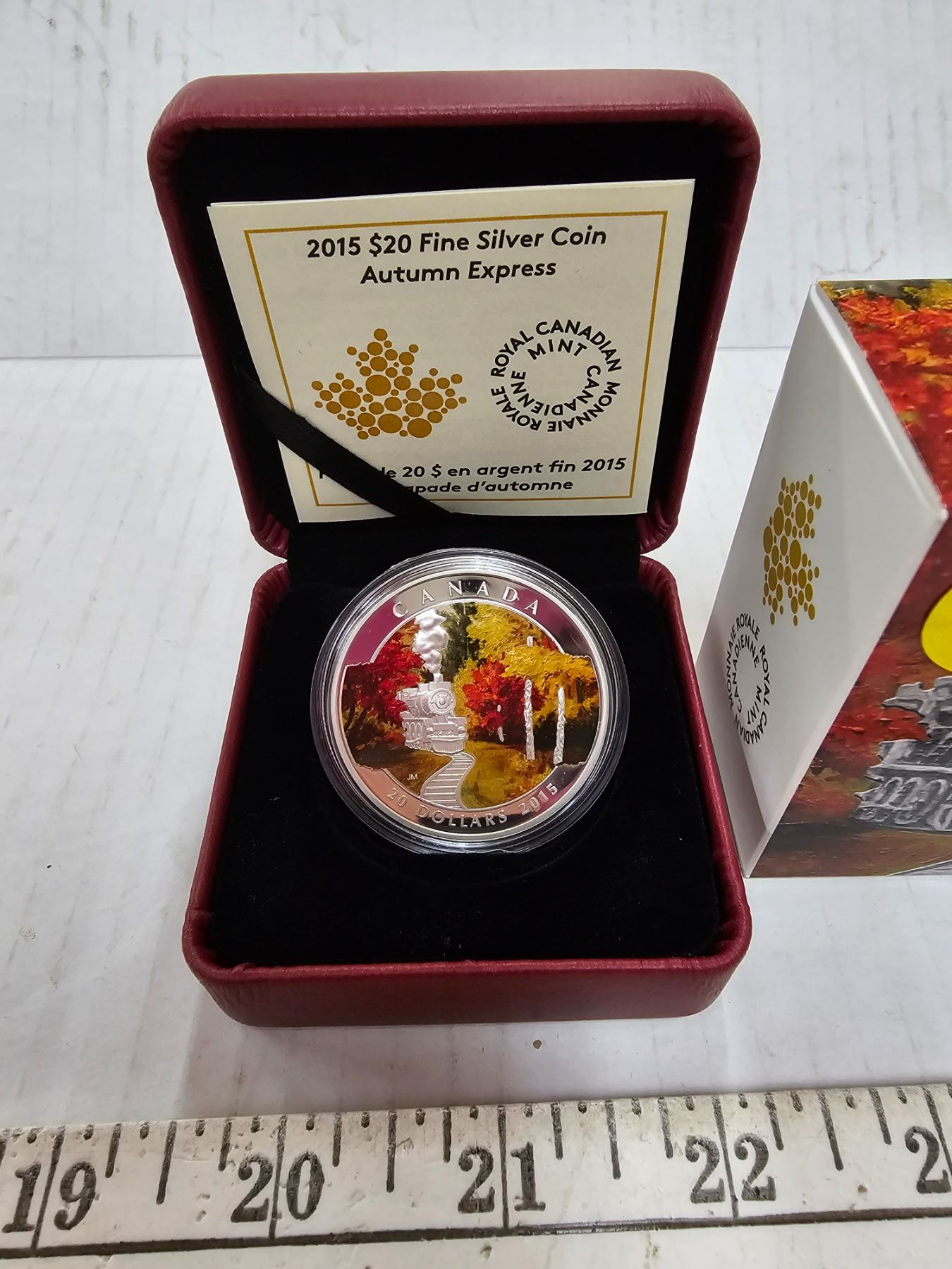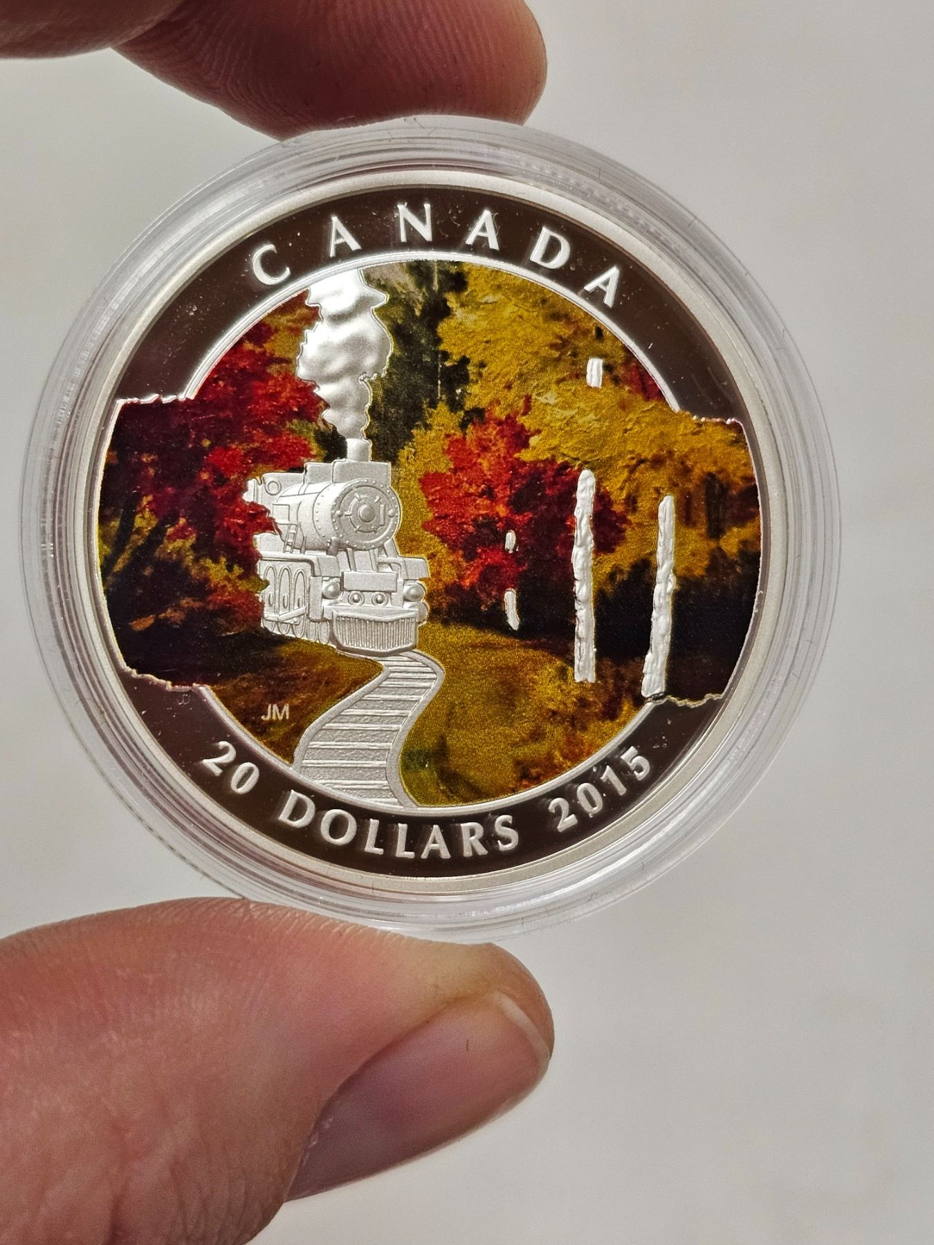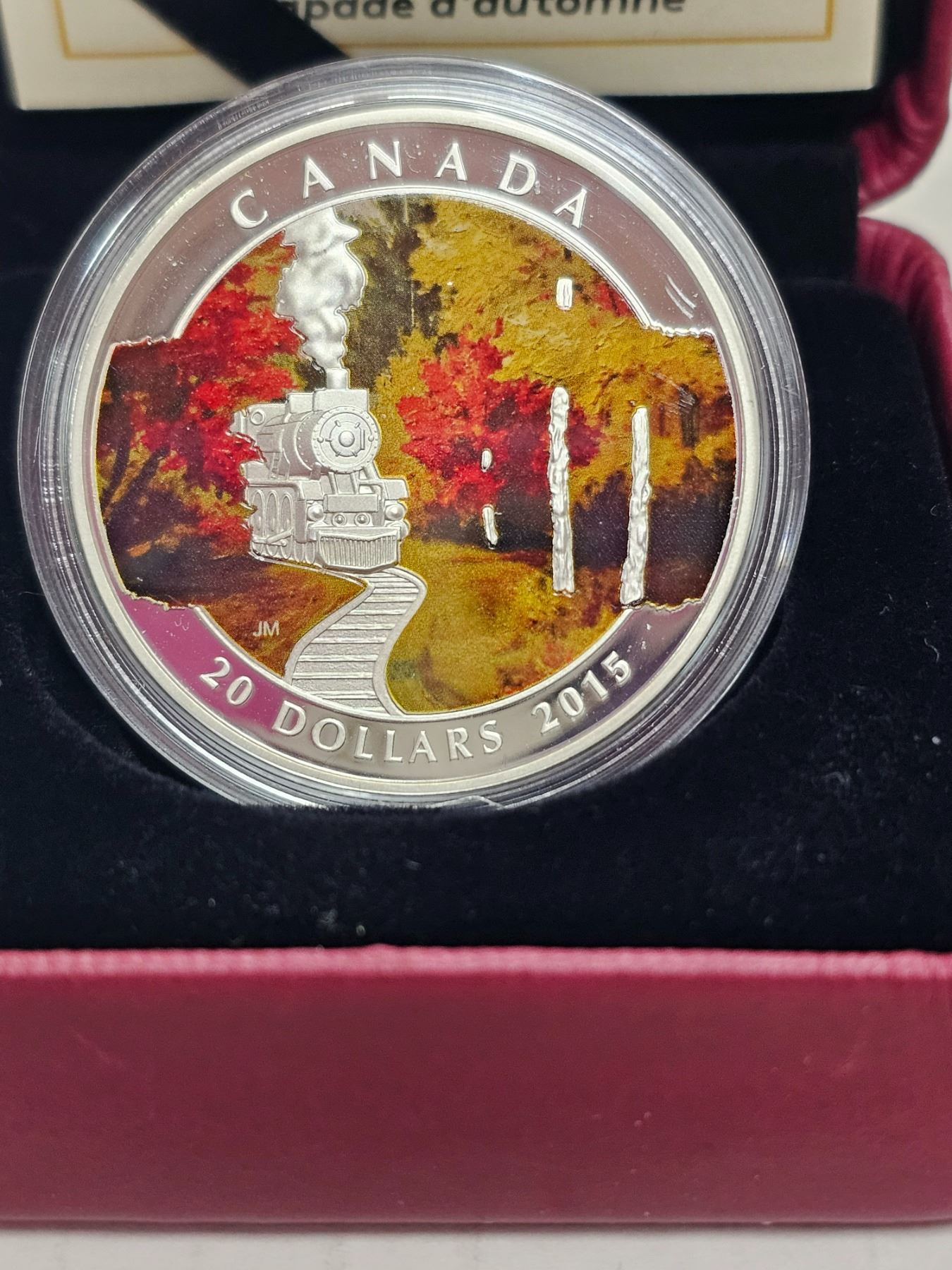 2015 $20 Autumn express. Train going through forest. Colourized proof with ultra heavy cameo. 99.99% pure silver. Housed in its origianl royal canadian mint case & box of issue, along with a certificate of authenticity