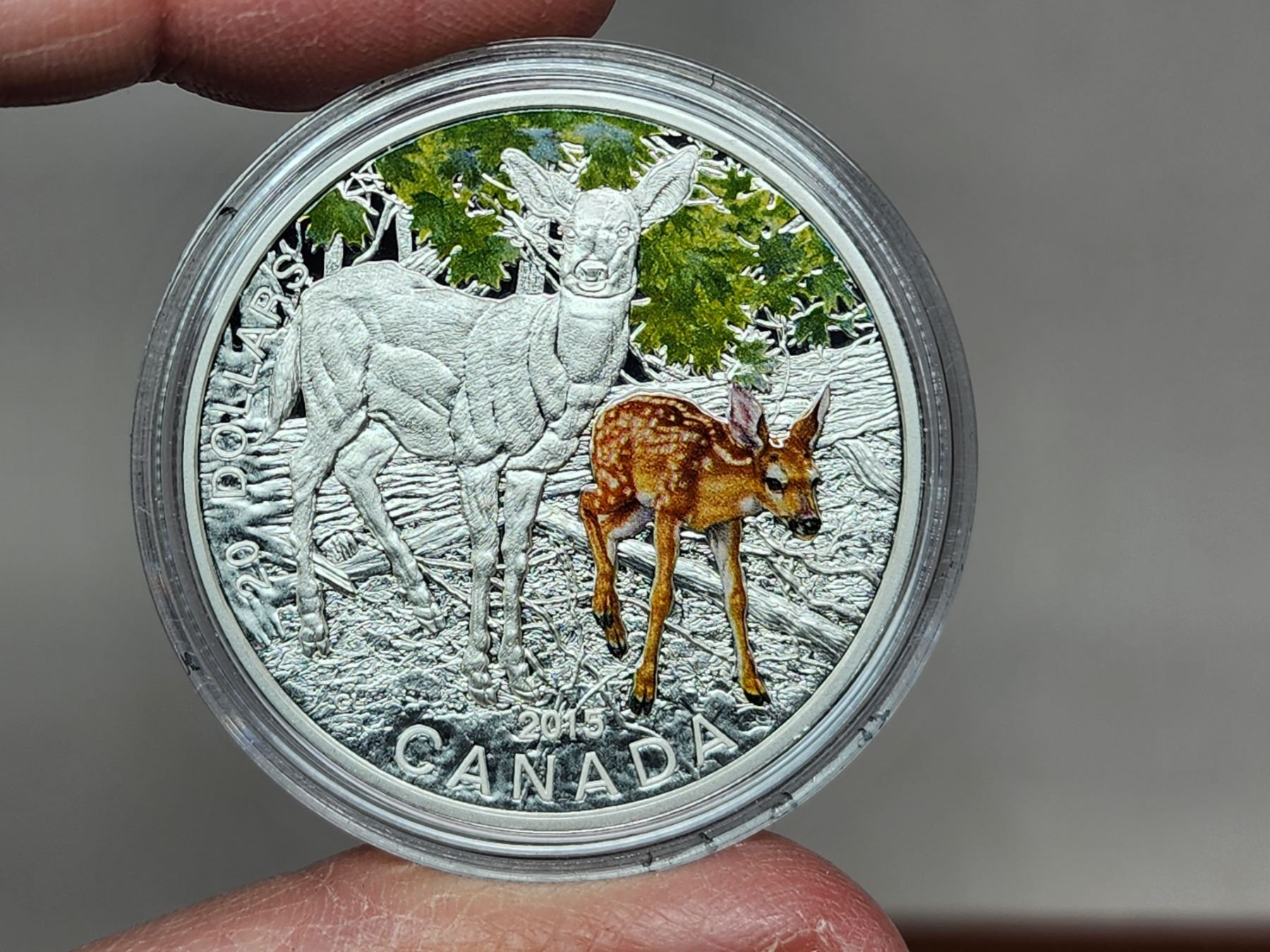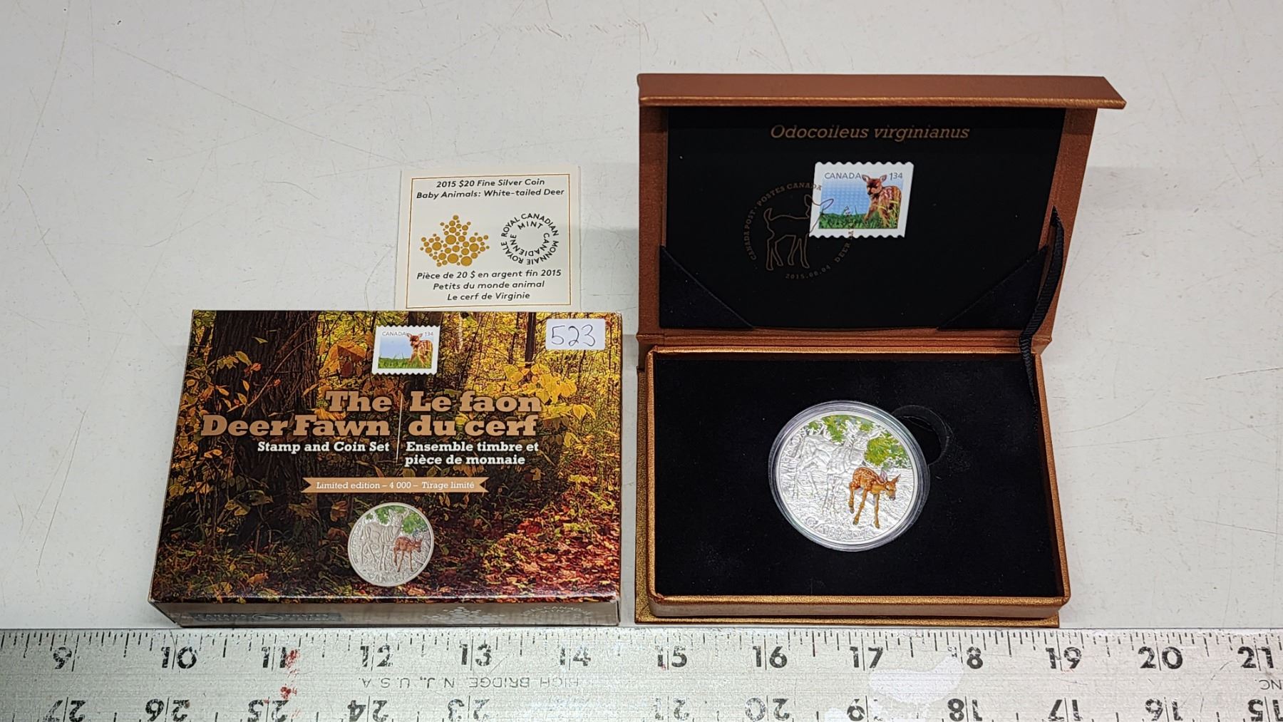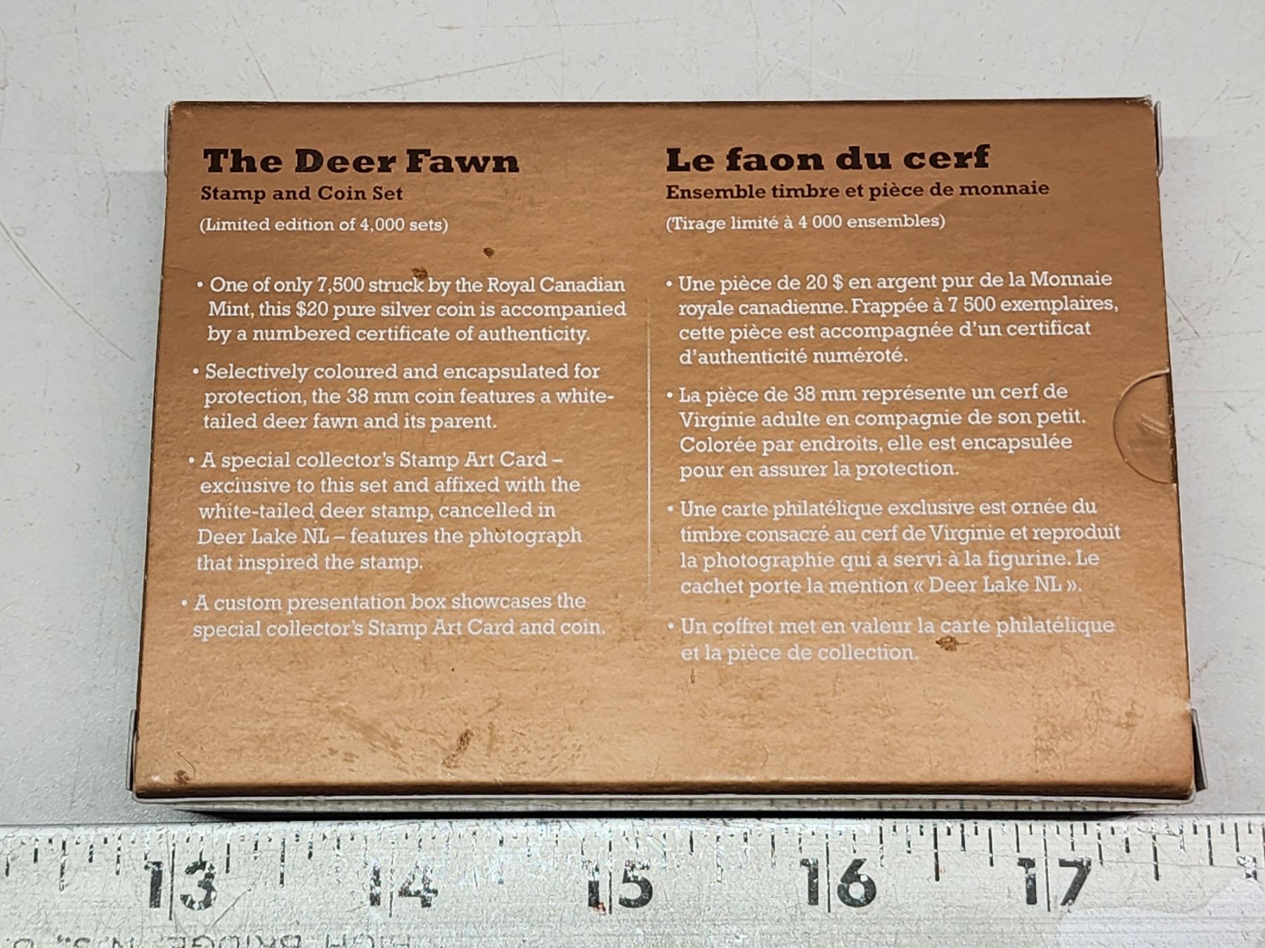 2015 $20 Baby Animals: The Deer Fawn Stamp & Coin Set. 99.99% pure Silver Colourized White-Tailed Deer Fawn & Mother plus $1.34 Stamp. Proof with Ultra Heavy Cameo. Housed in its original RCM case & box of issue.