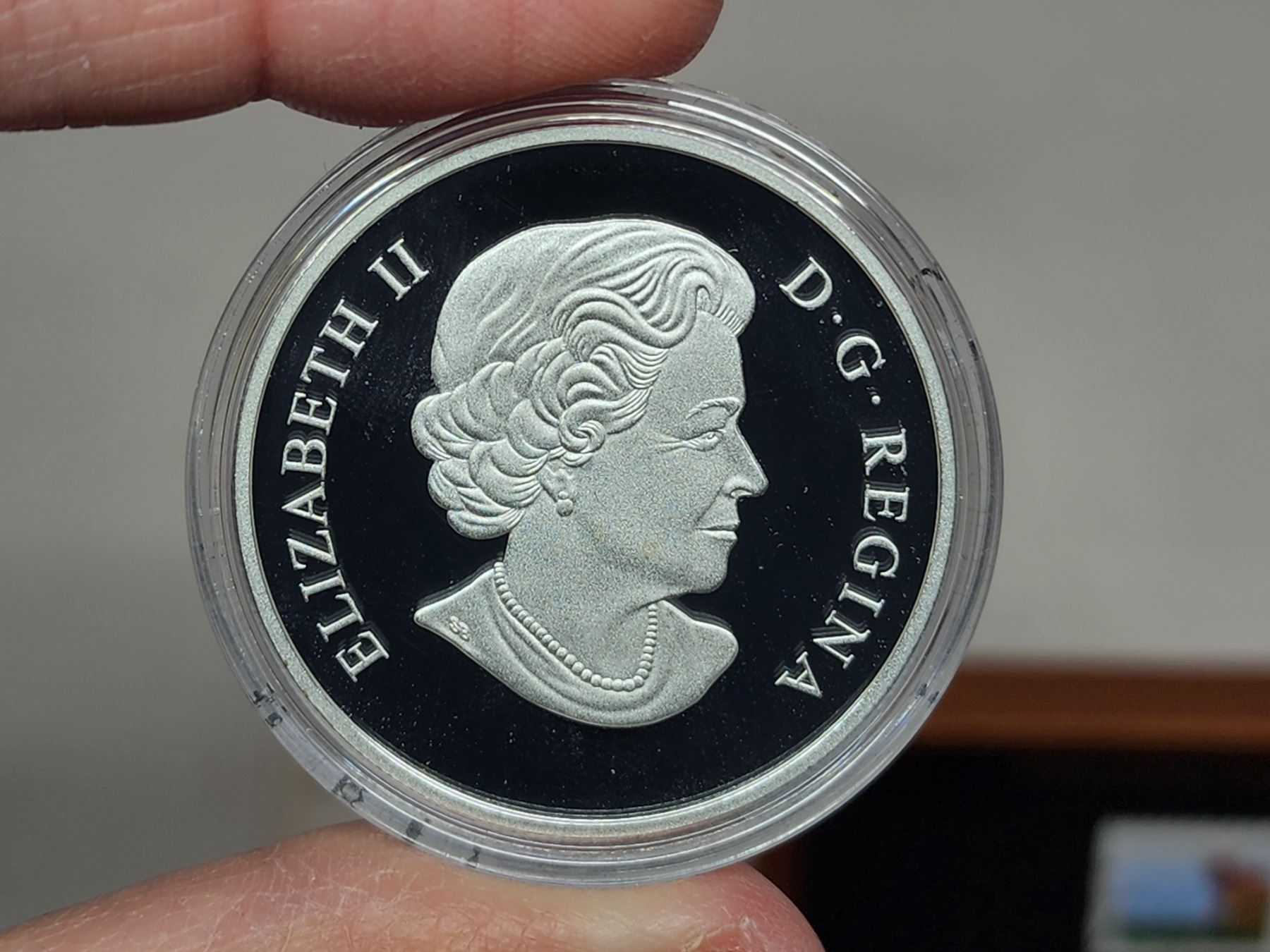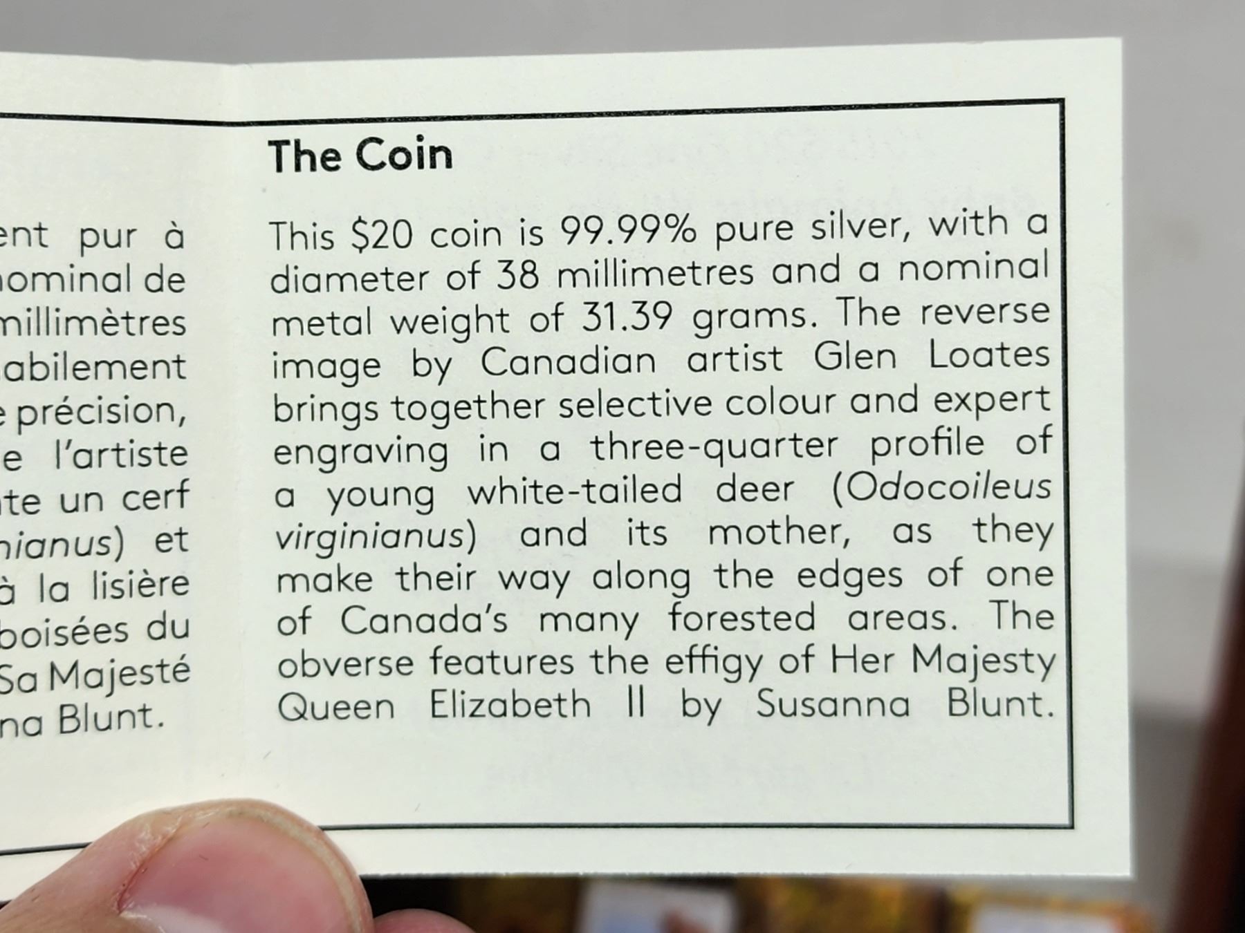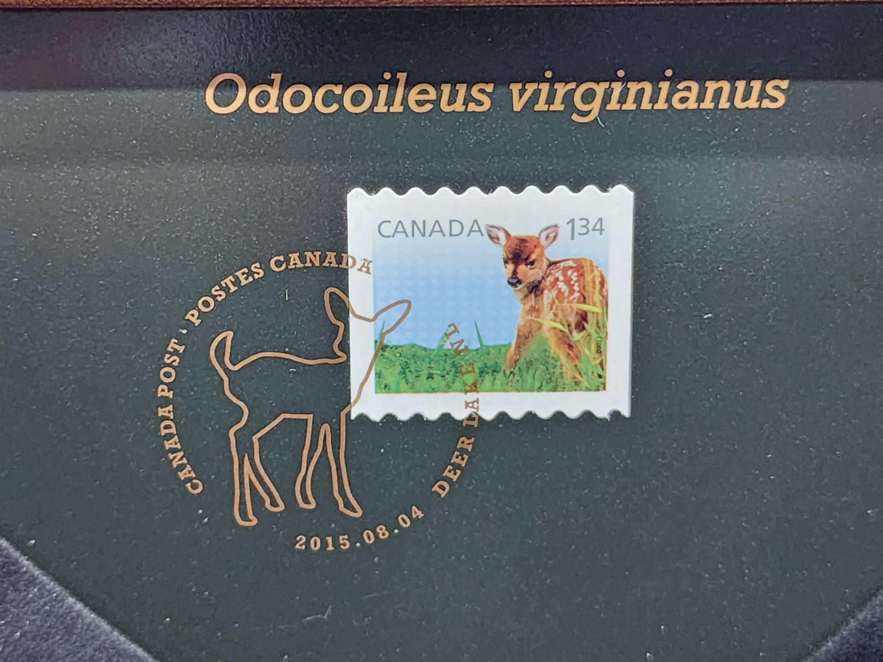2015 $20 Baby Animals: The Deer Fawn Stamp & Coin Set. 99.99% pure Silver Colourized White-Tailed Deer Fawn & Mother plus $1.34 Stamp. Proof with Ultra Heavy Cameo. Housed in its original RCM case & box of issue.