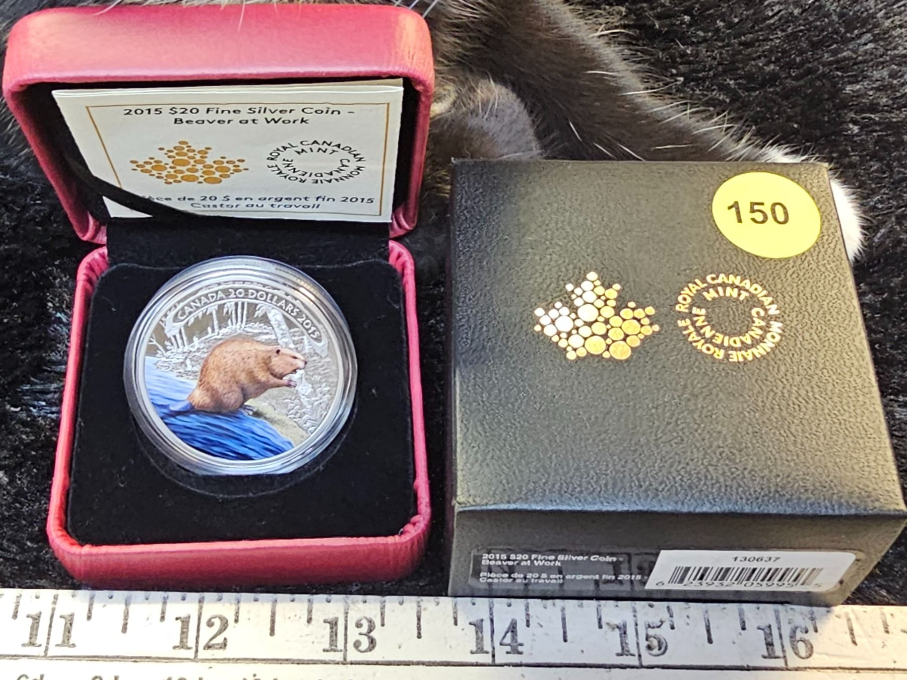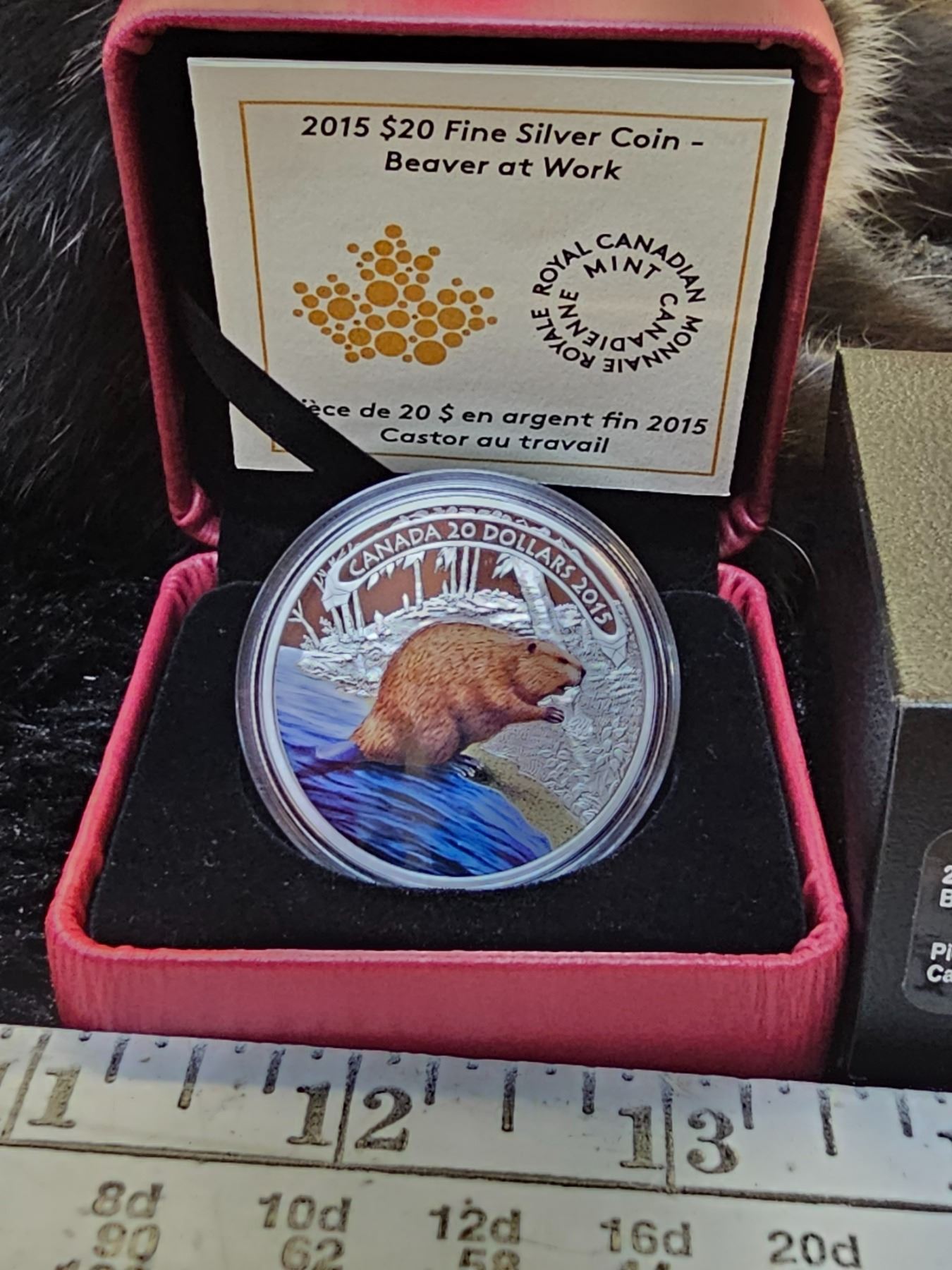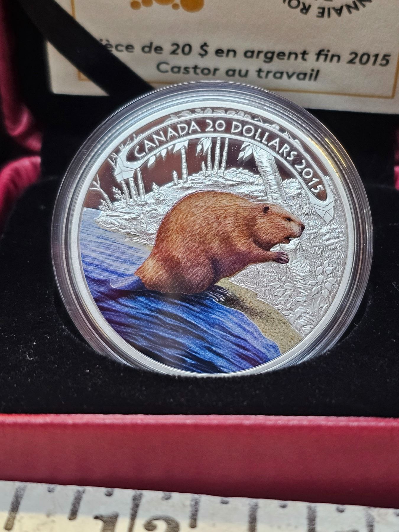 2015 $20 Beaver at Work. Colourized. Proof with Ultra Heavy Cameo. 99.99% pure Silver. Housed in its original Royal Canadian Mint case & box of issue, along with a Certificate of Authenticity.