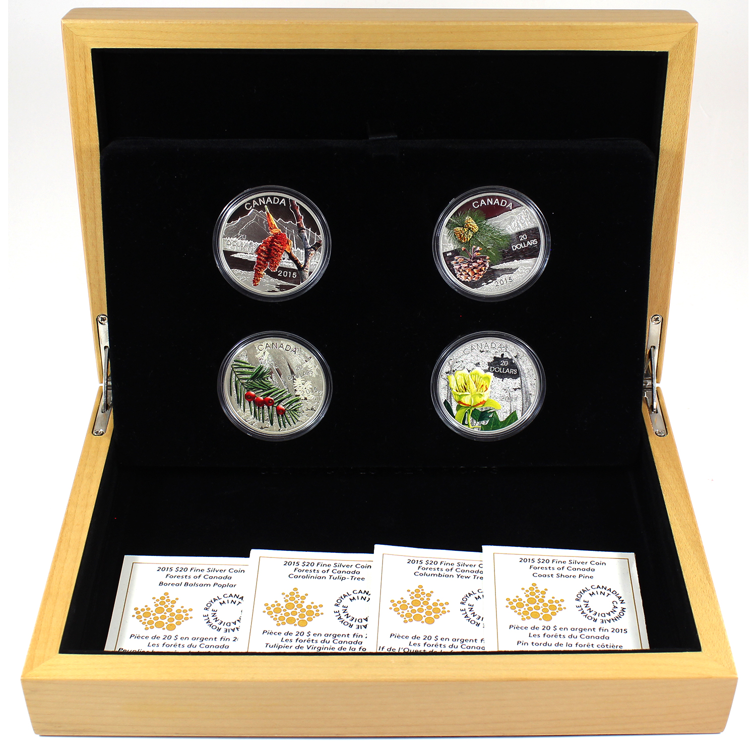 No outer box. Capsules may be scratched. Capsule for the Coast Shore Pine coin is broken.