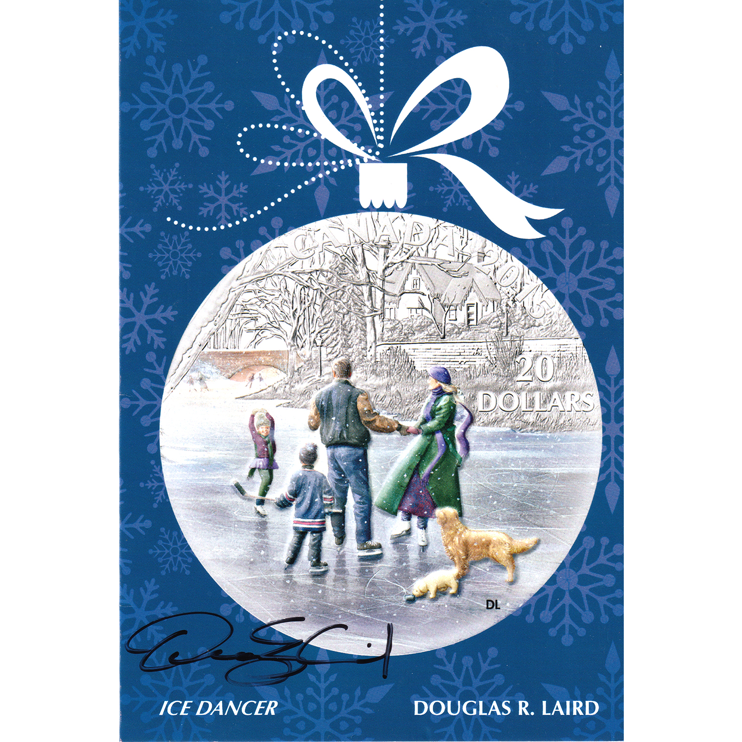 Coin is 1oz and .9999 fine with selective colour. It depicts a cozy family scene of a little girl dancing on the ice while her family looks on in adoration. A card with the same design is included, signed by the artist, Douglas R. Laird. (Tax Exempt)