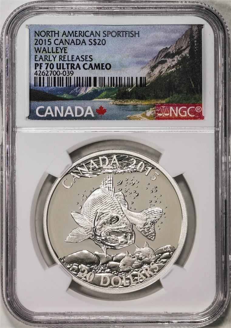 One 2015 $20 Proof Canada Walleye Silver Coin NGC PF70 Ultra Cameo Early Releases. NGC Certified.