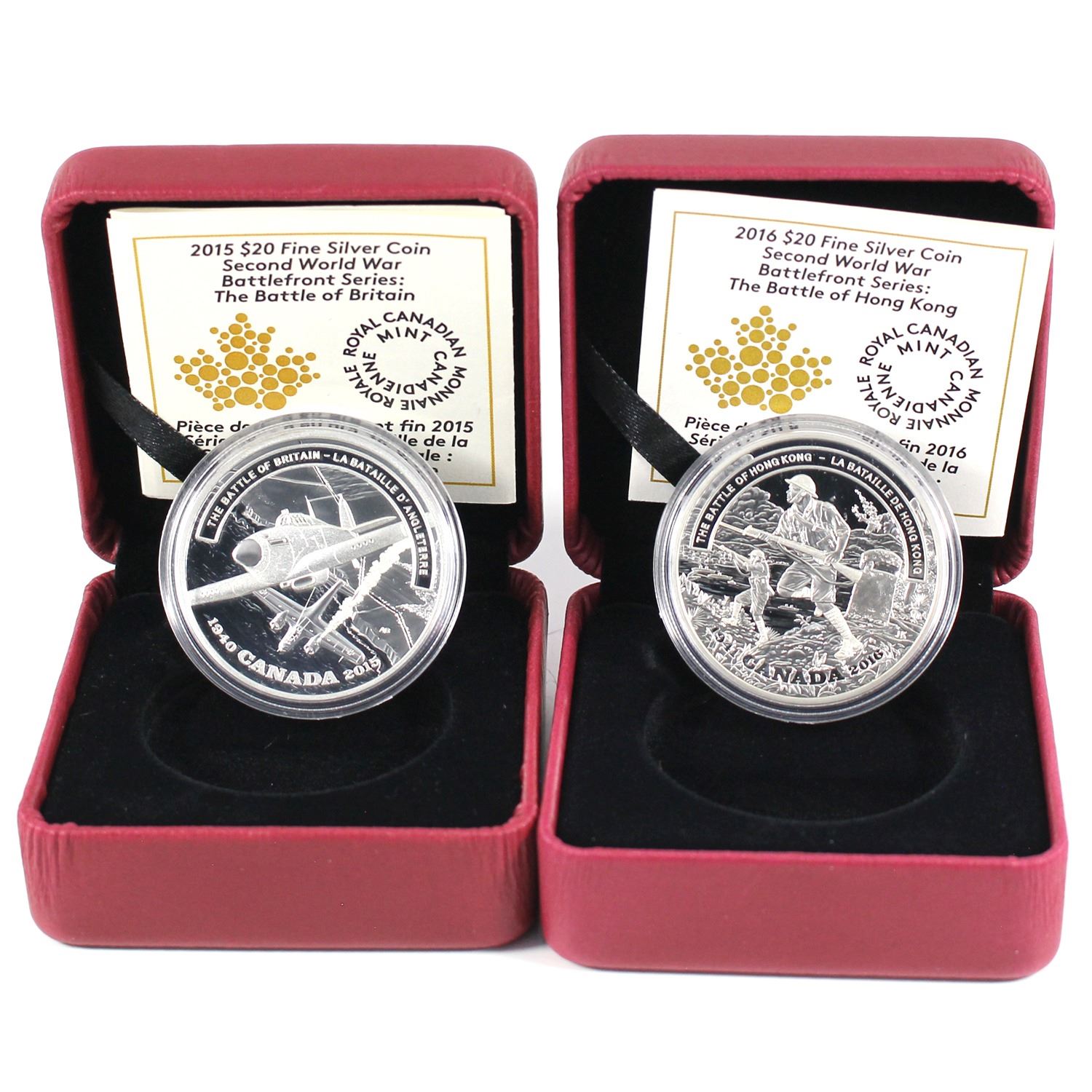 2015 & 2016 Canada $20 WWII Battlefront Series - 2015 The Battle of Britain & 2016 The Battle of Hong Kong Fine Silver Coins Encapsulated in Red RCM Display Boxes with COAs. 2pcs (TAX Exempt)