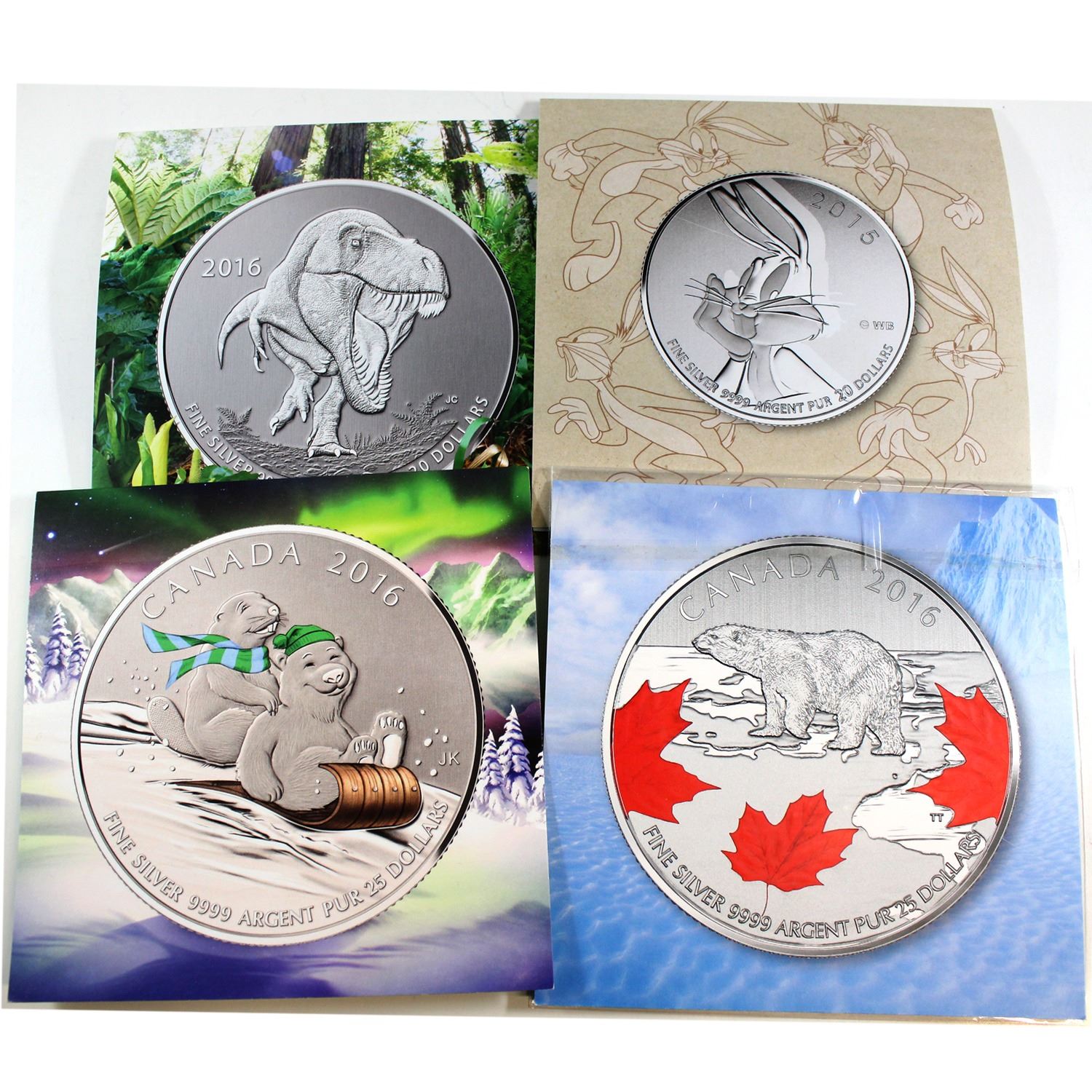 2015-2016 Canada Fine Silver coins (Tax Exempt): 2015 $20 for $20 Bug Bunny, 2016 $20 for $20 Tyrannosaurus Rex, 2016 Canada $25 for $25 True North, 2016 Canada $25 for $25 Winter Fun Fine Silver coins. 4pcs